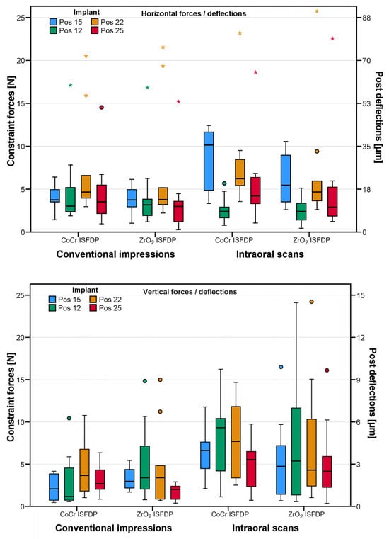 Grouped box-plot diagrams showing horizontal (top) and vertical (bottom) constraint forces/post deflections for both impression methods and implant positions of absolute horizontal and vertical constraint forces. Different implant positions are indicated by different colors. Circles symbolize mild outliers, and asterisks symbolize extreme outliers. ISFDP = implant-supported fixed dental prosthesis, CoCr = cobalt-chrome, and ZrO2 = zirconia.