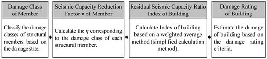 Since the residual or dissipated energy of RC structures is difficult to grasp on-site, the current Japanese guidelines mentioned above also provide a simplified calculation method for the residual seismic capacity ratio index, which employs visual damage information such as the maximum residual crack widths of members. As shown in Figure 1, the damage classes of structural members should be classified first from the damage state [,]. Then, a seismic capacity reduction factor η, which is defined as the ratio of the absorbable hysteretic energy after an earthquake to the original absorbable energy of each structural member, should be calculated corresponding to the damage classes of members [,,]. Considering the seismic capacity reduction factor η, a residual seismic capacity ratio index, which is defined as the ratio of post-earthquake seismic capacity to original capacity, can be calculated [,,,]. Finally, the damage of a building can be rated based on the damage rating criteria [,,,].