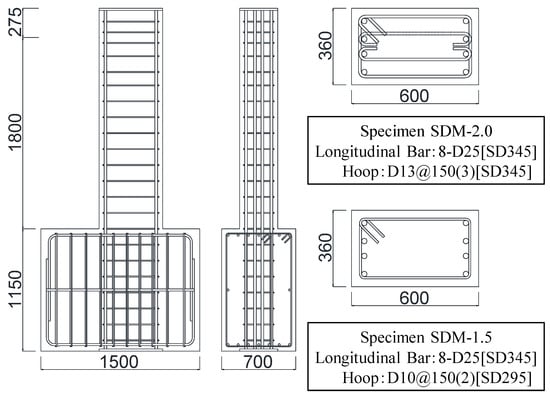 The calculated results of the ultimate flexural strength (Qmu) and the shear strength (Qsu) using Equations (1) and (2) are summarized in Table 3. Here, the shear strength margin was defined as the ratio of Qsu to Qmu, and Qsu was adjusted using the reinforcement ratio and yield strength of transverse reinforcement, while Qmu was the same for each specimen []. Then, two specimens were fabricated with shear strength margins of 2.02 (specimen SDM-2.0; the transverse reinforcement ratio was 0.706% and the standard yield strength of transverse reinforcement was 345 MPa) and 1.57 (specimen SDM-1.5; the transverse reinforcement ratio was 0.264% and the standard yield strength of transverse reinforcement was 295 MPa).