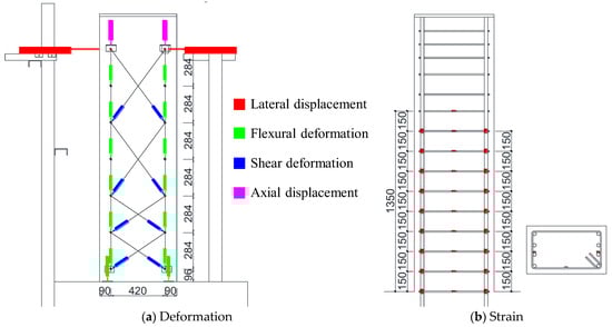 As shown in Figure 4, flexural and shear deformations at each beam section were measured using displacement transducers (LVDTs). Strains in the longitudinal and transverse reinforcement were also recorded using strain gauges. Furthermore, the crack width and length were measured at the peak and unloading moment of each loading cycle for all lateral drift angles. Here, the crack width was measured visually using a crack scale, with the most open position value for each crack being recorded as its width. On the other hand, the crack length was calculated automatically using CAD software (AutoCAD 2020), which was digitized at the same scale after being measured visually. Detailed discussions on the flexural and shear deformations, as well as the damage, are presented in Section 3 and Section 4.