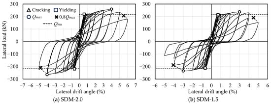 In specimen SDM-2.0, yielding of the tensile longitudinal reinforcement was observed at lateral drift angles of R = +0.61% and −0.60% under positive and negative loading, respectively. The maximum strengths of +259.5 kN and −265.0 kN were recorded at R = 4.0% of each loading direction, which were approximately 1.18 times higher than the calculated value (Qmu). The load bearing capacity remained above 80% of the maximum strength even at R = +5.50% and −4.83%.