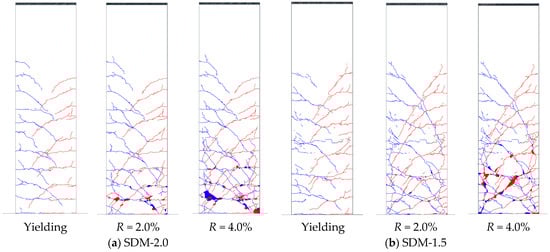 Figure 6 illustrates the crack patterns of each specimen at the loading stage of tensile longitudinal reinforcement yielding, as well as R = 2.0% and 4.0%. In the figure, the blue and red lines indicate cracks formed during positive and negative loading, respectively.