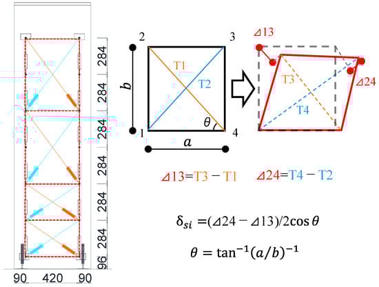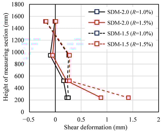 Based on the previous research by Uchino et al. [], as shown in Figure 7, the shear deformation of each measured section (δsi) in the axial direction of the specimens was calculated. Figure 8 illustrates the shear deformation distributions of both specimens at the drift angles of R = +1.0% and +1.5%. At R = +1.0%, the shear deformation at a height of approximately 200 mm above the critical section was close to each specimen. However, at R = +1.5%, the shear deformation at the same measured section was 1.42 mm for specimen SDM-1.5, which is approximately 1.6 times larger than that of specimen SDM-2.0. This indicates that the shear deformation of specimen SDM-1.5 tended to be greater than specimen SDM-2.0 at the subsequent drift angles, which means the shear deformation is more dominant in the RC beams with low shear strength margins, consistent with previous research conducted by Maeda et al. [].