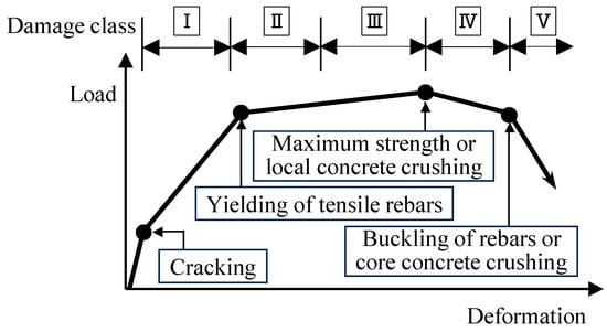 Damage classification of the specimens was performed based on the damage definition shown in Figure 9 and Table 4. The damage classes of the RC beams are originally defined based on the mechanical properties (engineering demand parameters), such as cracking of concrete, tensile longitudinal reinforcement yielding, and maximum strength in Japanese guidelines (JBDPA, 2015) []. Furthermore, the relationships between the damage class and visual damage information, such as maximum residual crack width, are also defined to easily classify the damage class on-site. Figure 9 schematically illustrates the load carrying capacity, load–deflection curve, and member damage class, and RC members are classified in one of five categories (I through V), as defined in Table 4.