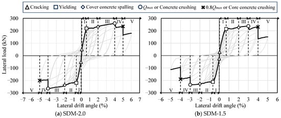 In specimen SDM-2.0, flexural cracks were observed along the critical section at a loading cycle of R = 0.0625%, and shear cracks occurred at a 0.5% loading cycle. After tensile longitudinal reinforcement yielding, crushing and spalling of the cover concrete occurred near the critical section at a 2.0% loading cycle. The damage, such as crack widths and concrete crushing area, extended intensely as the lateral drift angle increased; finally, crushing of the core concrete was observed with exposure of longitudinal reinforcement at a 5.0% loading cycle.