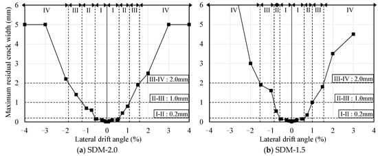 Table 5 shows the final damage class evaluation results and boundary values of the lateral drift angle to classify the damage class for each specimen. The boundary values of the lateral drift angle that classify damage classes up to III were similar for both specimens. However, as discussed above, because the shear strength margin influenced the deformation capacity and shear deformation distribution of RC beams, the boundary values of the lateral drift angle that classified damage classes above III tended to be smaller in specimen SDM-1.5 compared to SDM-2.0.