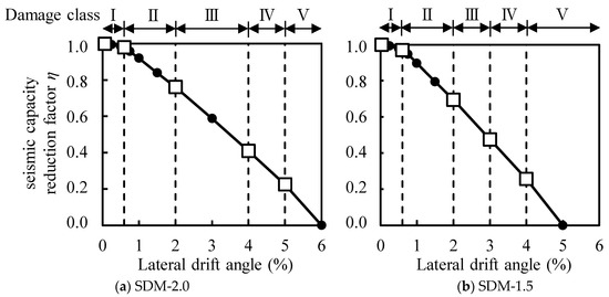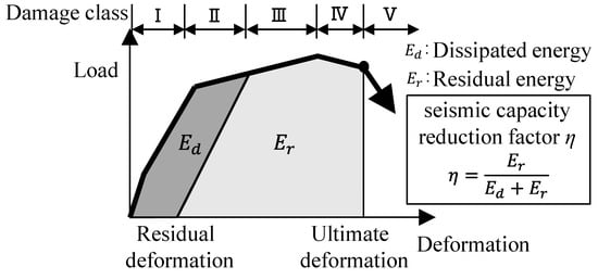 The seismic capacity reduction factor η of each specimen was calculated based on the previous method developed in the Japanese guidelines (JBDPA, 2015) [], which is defined as the ratio of the absorbable hysteretic energy after an earthquake to the original absorbable energy of structural members, as illustrated in Figure 12. Figure 13 shows the calculated result of factor η for each specimen relating to the damage classes determined in Section 4.2. Table 6 arranges the boundary value of factor η to classify the damage class for each specimen, as shown in Figure 13 with the symbol □, comparing it to the values of the ductile beam defined in the Japanese guidelines (JBDPA, 2015) []. Here, factor η was calculated using a positive loading test only. It was found that the effect of the difference in shear strength margins on the seismic capacity reduction factor η was limited, and the boundary value of factor η was generally consistent with the specified value for the ductile beam.