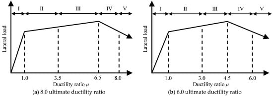 Figure 14 shows the proposed correlation models between damage class and ductility ratio for flexural RC beams with ultimate ductility ratios of 6 and 8. Here, the boundary values of the ductility ratio were simplified by applying the approximate values of the detailed calculation results, as shown in Table 8, and the detailed calculation results adopted smaller values for positive and negative loading, as discussed in Table 7. As a result, the correlation model was established by using the ultimate ductility ratio to represent the difference in deformation capacity of RC beams, and the boundary values of the ductility ratio were proposed for classifying damage classes; these would also be applicable to estimate the damage classes of RC beams based on their deformation.