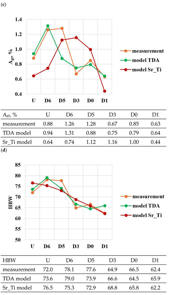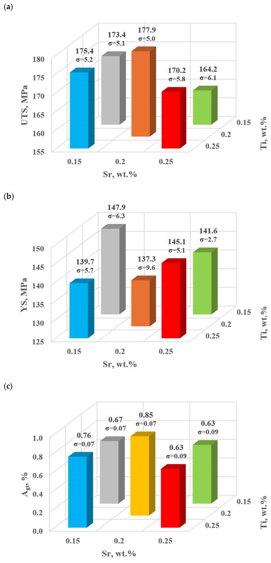 Since it is difficult to keep the concentration of individual elements in the alloy “exactly on point”, the following range of variation in the concentration of Sr = 0.02–0.04 wt.% and Ti = 0.06–0.08 wt.% after modification in the EN AC-46000* alloy was proposed in order to achieve simultaneously the highest possible UTS, YS, Agt and HBW properties and the lowest possible DI index value. In Table 15, Table 16, Table 17, Table 18 and Table 19, the selected ranges of Sr and Ti concentrations and the corresponding values of the analyzed properties or objective function in Table 20 are distinguished by bold+italic style.