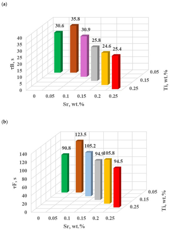 - The optimal modifier concentration range was determined: Sr = 0.02–0.04 wt.% and Ti = 0.06–0.08 wt.%, with the proviso that to maintain a low DI index, the concentration of Sr = 0.02 wt.% in the melt should be kept as low as possible,