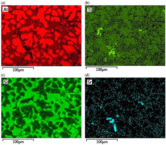 In Al-Si alloys, the effect of Ti on their microstructure and wear resistance was studied up to about 4 wt.% Ti [19]. With this amount, titanium forms intermetallic phases. Only a smaller addition of Ti at levels up to about 1.5 wt.% has a modifying effect on the microstructure of Al-Si alloys (an alloy that solidifies in an electric field) [20]. Based on studies [6,8,9] related to the effect of Ti as a modifier in Al-Si alloys, the same range of Ti concentration in the studied alloy was assumed as for Sr.