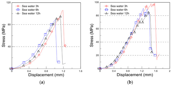 Compressive stress with displacement curve for the seawater, saltwater, and distilled water immersion ((a): 9 mm, (b): 18 mm thickness for the seawater immersion, (c): 9 mm, (d): 18 mm thickness for the saltwater immersion, (e): 9 mm, and (f): 18 mm thickness for the distilled water immersion).