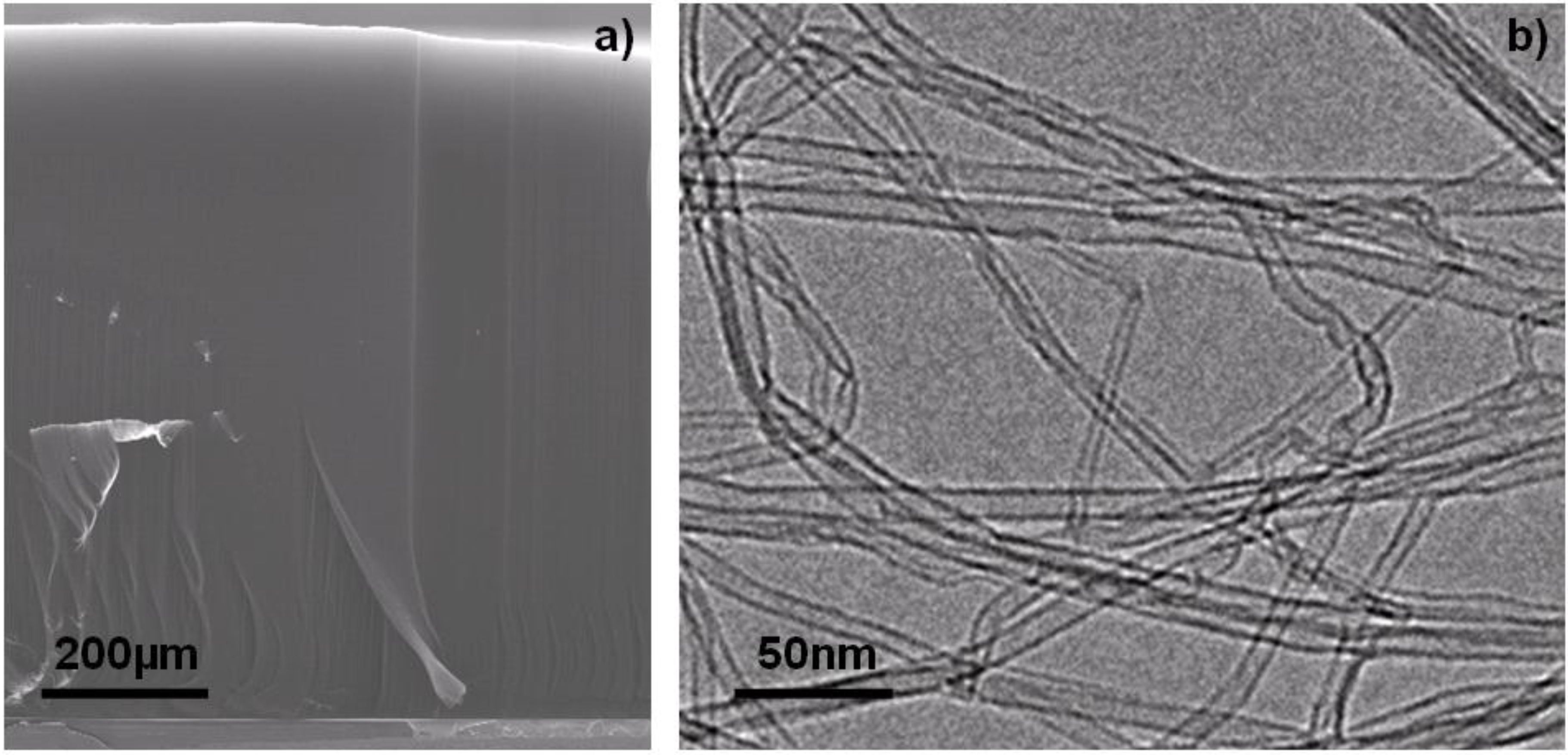 - Yamada, T.; Namai, T.; Hata, K.; Futaba, D.N.; Mizumo, K.; Fan, J.; Yudasaka, M.; Yumura, M.; Iijima, S. Size-selective growth of double-walled carbon nanotube forests from engineered iron catalysts. Nat. Nanotechnol. 2006, 1, 131–136. [Google Scholar] [CrossRef] [PubMed]