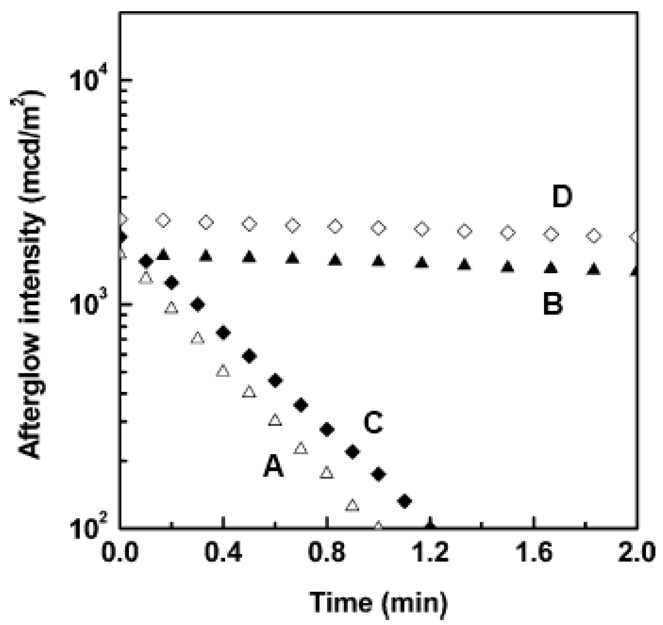 - Takasaki, H.; Tanabe, S.; Hanada, T. Long-lasting afterglow characteristics of Eu, Dy codoped SrO-Al2O3 phosphor. J. Ceram. Soc. Jpn. 1996, 104, 322–326. [Google Scholar] [CrossRef]