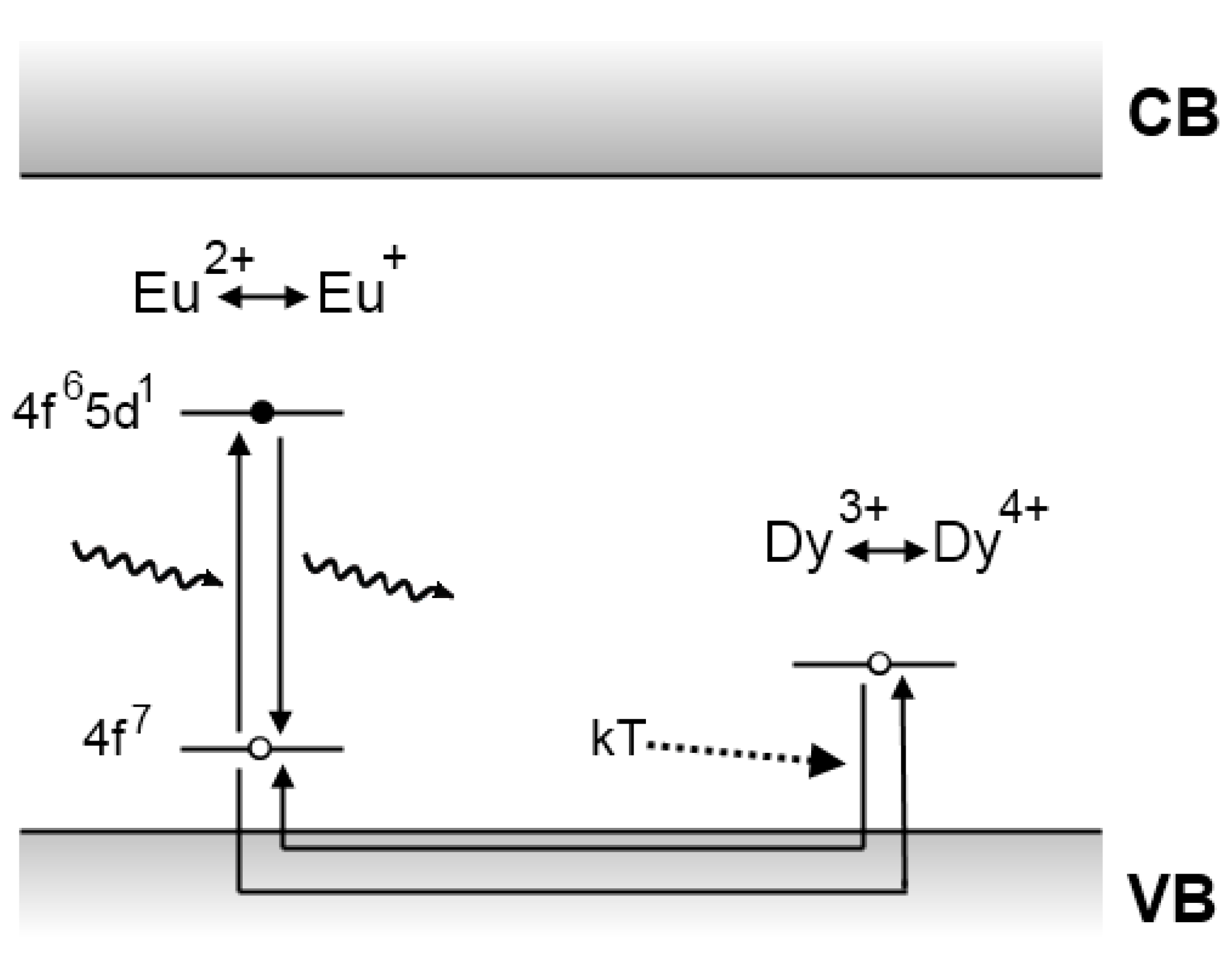 - Dorenbos, P. Mechanism of persistent luminescence in Eu2+ and Dy3+ codoped aluminate and silicate compounds. J. Electrochem. Soc. 2005, 152, H107–H110. [Google Scholar] [CrossRef]