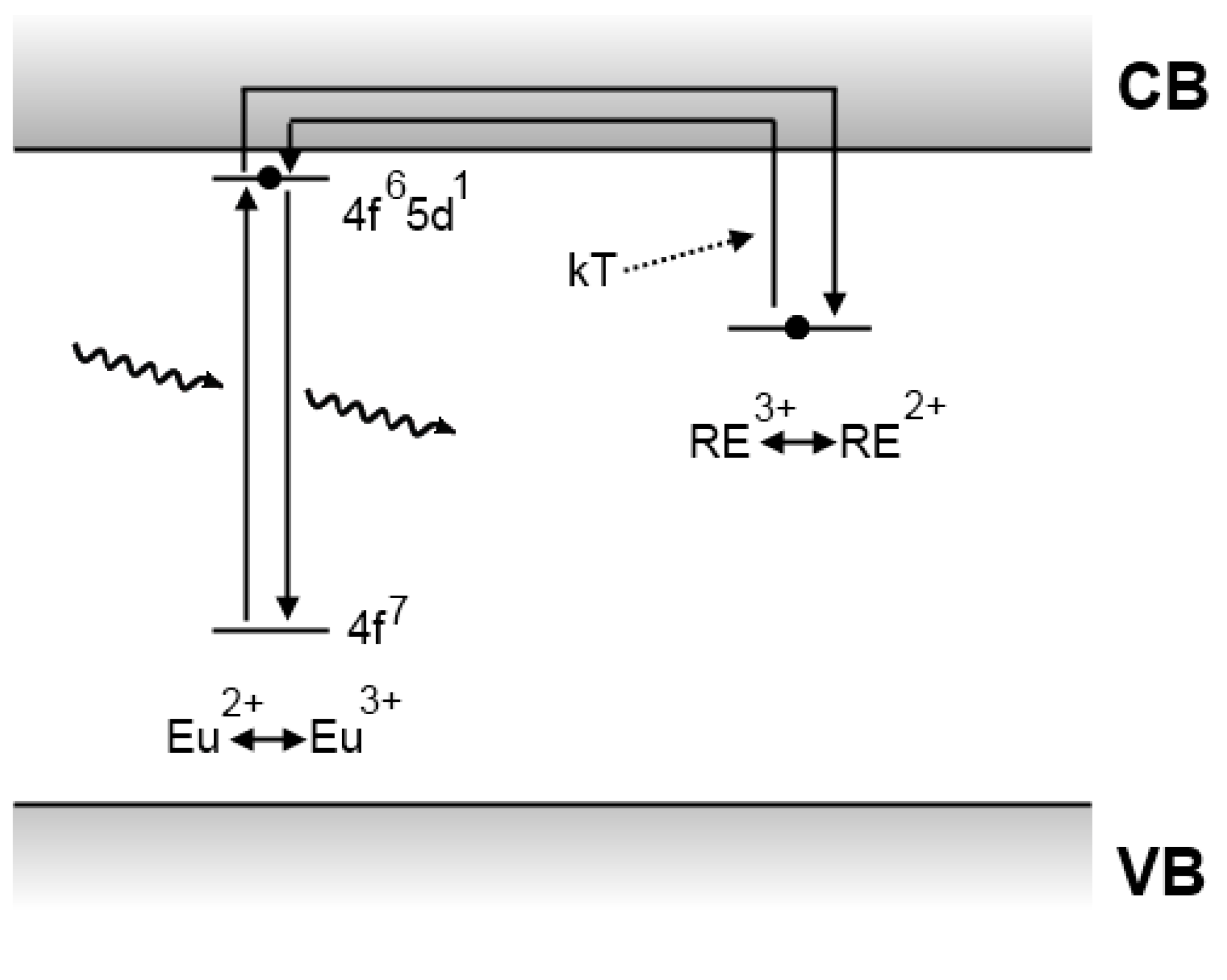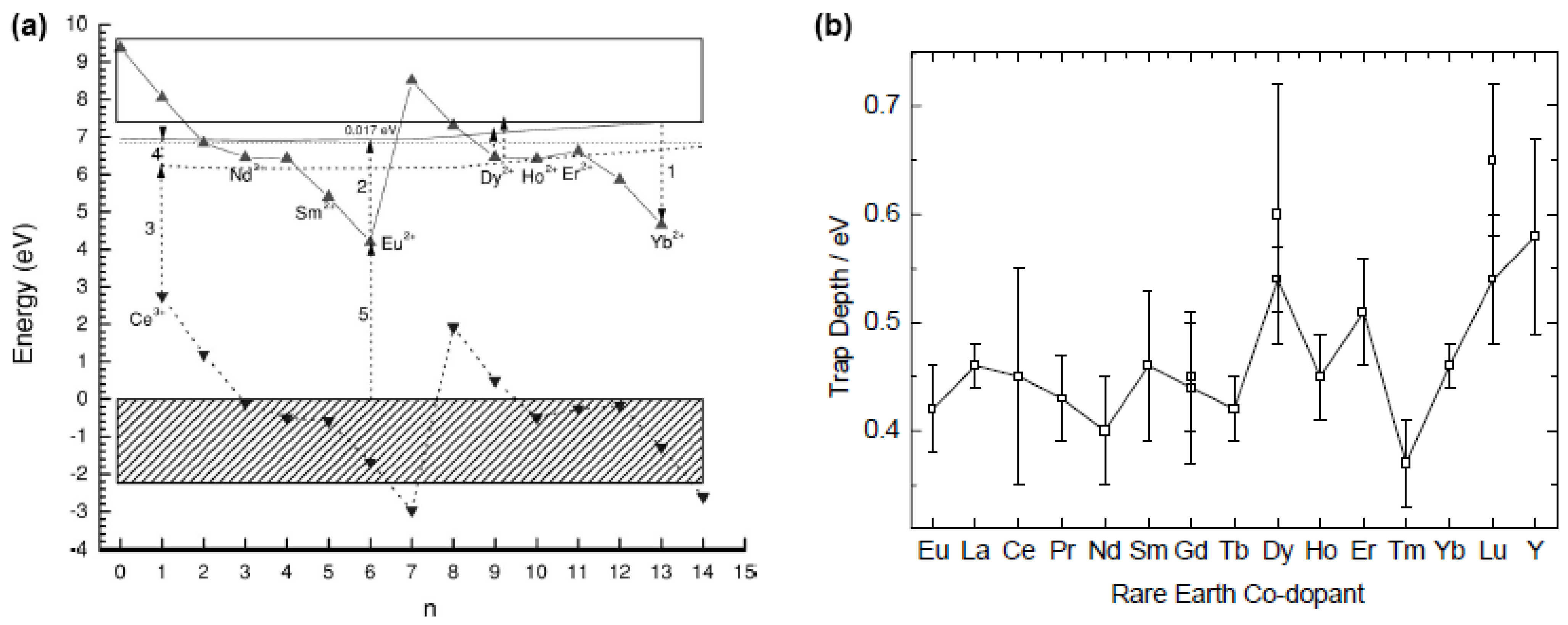 - Dorenbos, P. Locating lanthanide impurity levels in the forbidden band of host crystals. J. Lumines. 2004, 108, 301–305. [Google Scholar] [CrossRef]
