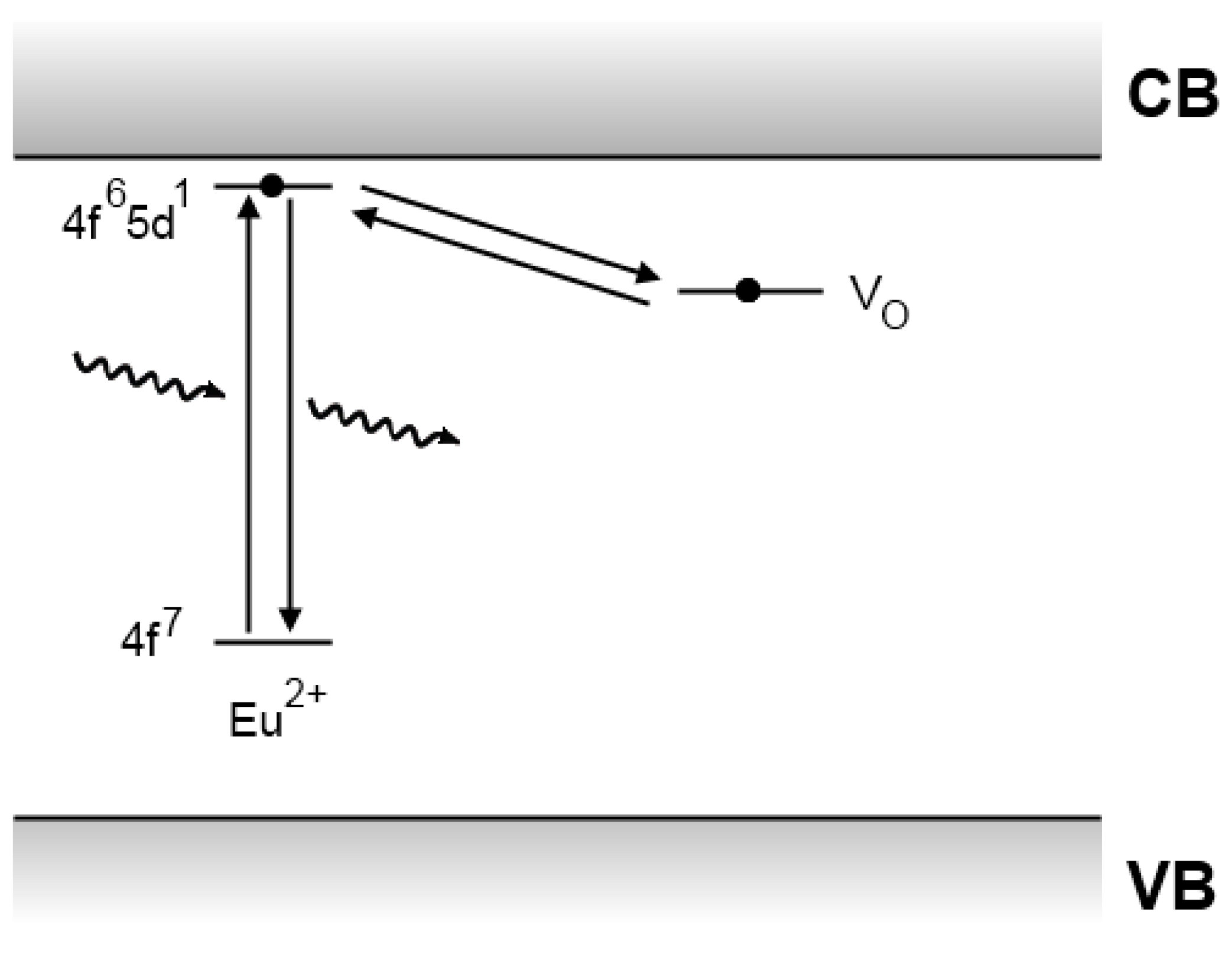 - Dorenbos, P. Energy of the first 4f7-->4f65d transition of Eu2+ in inorganic compounds. J. Lumines. 2003, 104, 239–260. [Google Scholar] [CrossRef]