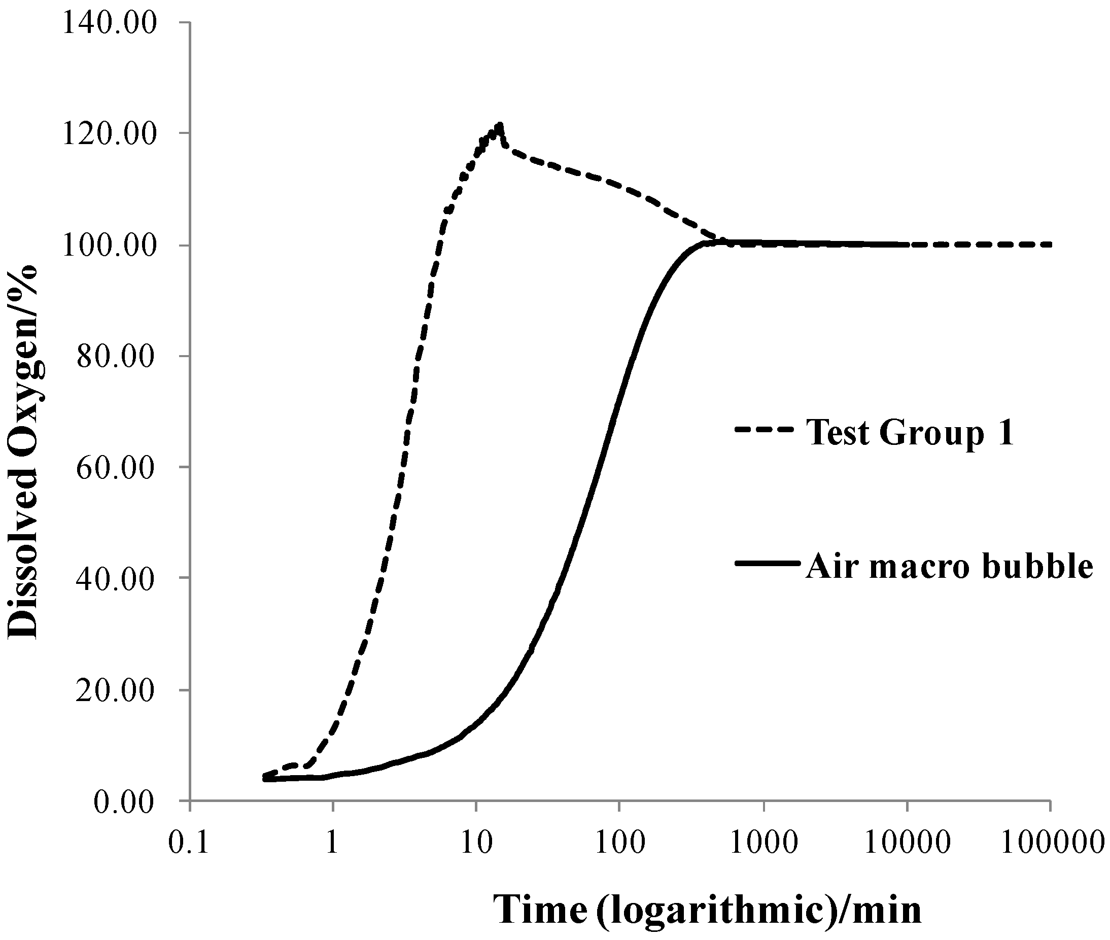 The dissolved oxygen in different test groups was shown in the form of percentage over saturation value. Figure 2 shows the dissolved oxygen changes with time of test group 1, compared to that of air macro bubbles in the same water condition. It can be seen that the peak value of dissolved oxygen is 120%, much higher than air macro bubbles (100%), which indicates high oxygen transfer efficiency.