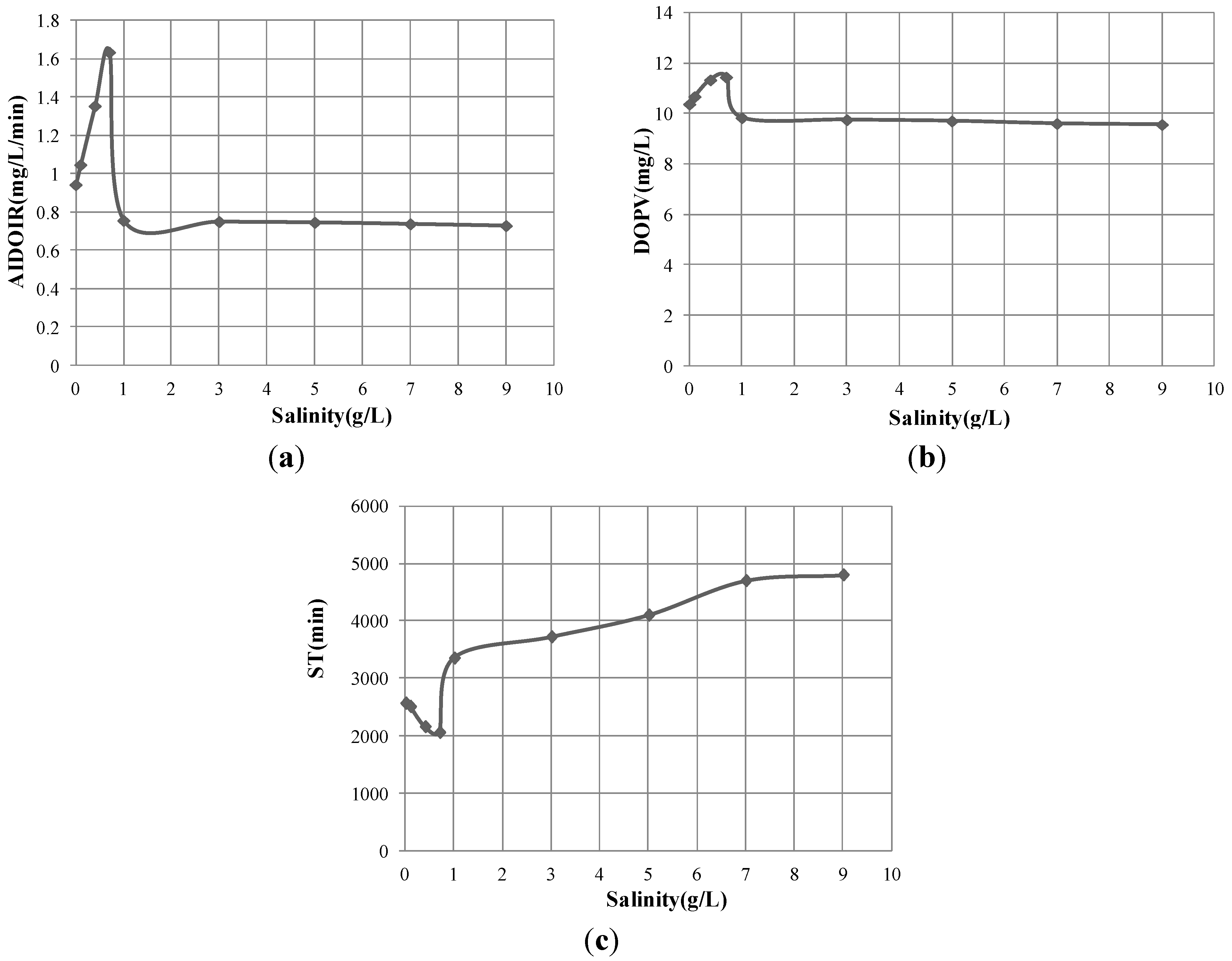 In Figure 3, salinity 0.7 g/L was a turning point for all three parameters. AIDOIR and DOPV reached the maximum value, 1.636 mg/L/min and 11.45 mg/L respectively, while ST reached the minimum value (2060 min) at salinity 0.7 g/L. The mechanism is discussed in Section 3.4.