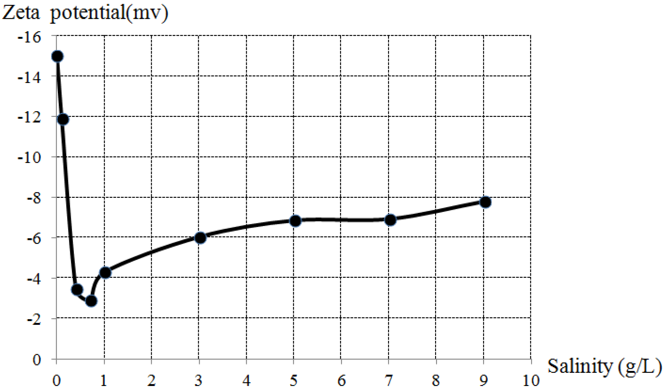 - The lowest zeta potential value was obtained as –2.9 mV at the salinity of 0.7 g/L.