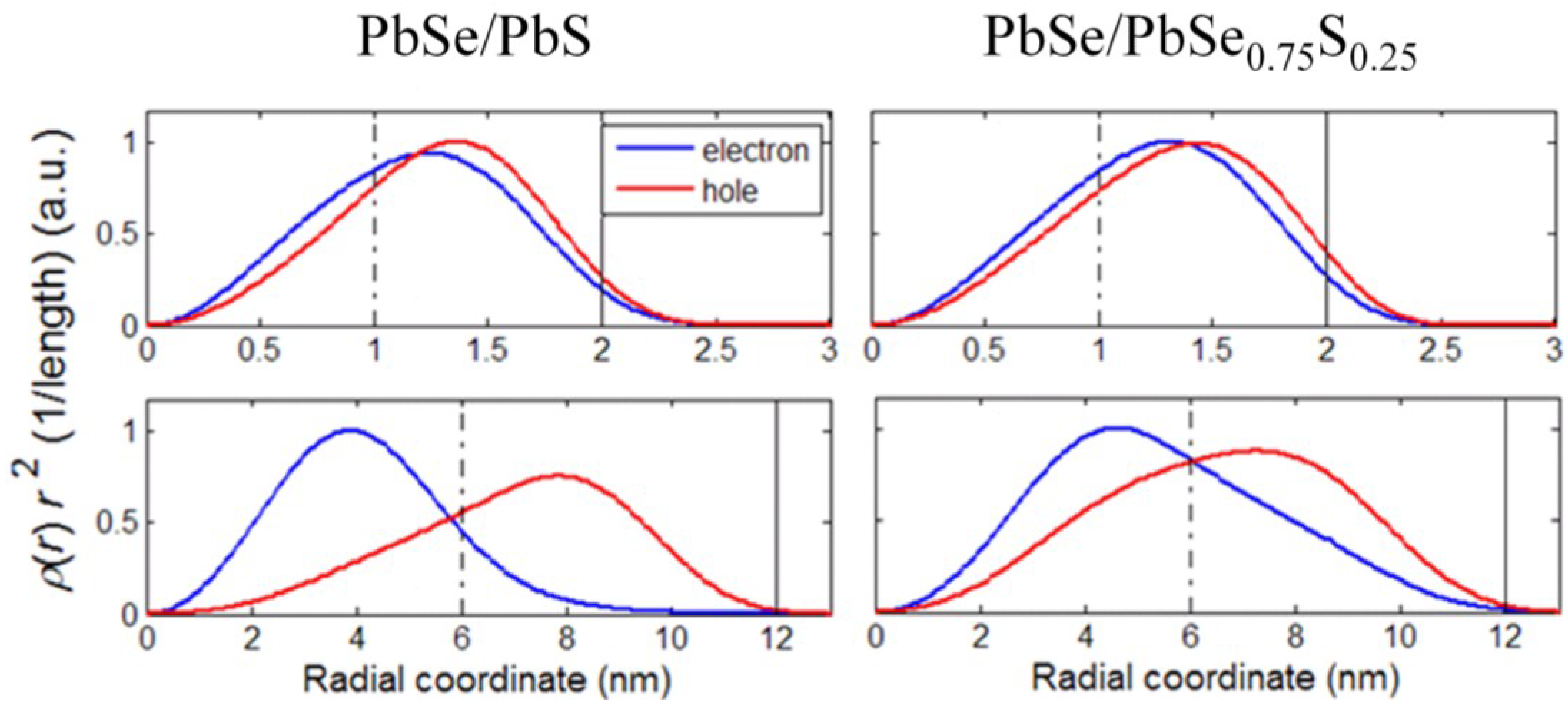 Figure 3 shows the radial probability density of the ground-state electron and hole in the PbSe/PbS, PbSe/PbSe0.75S0.25 heterostructures with RC = 1 nm, RS = 2 nm (top row) and RC = 6 nm, RS = 12 nm (bottom row). It can be seen that the electron-hole charge separation becomes more pronounced with the growth of the overall QD size at a constant RS/RC ratio. In addition, charge separation appears to be slightly more efficient in PbSe/PbS as compared to alloyed PbSe/PbSe0.75S0.25 QDs because of larger band offsets in the former structure (see Figure 3, bottom row).