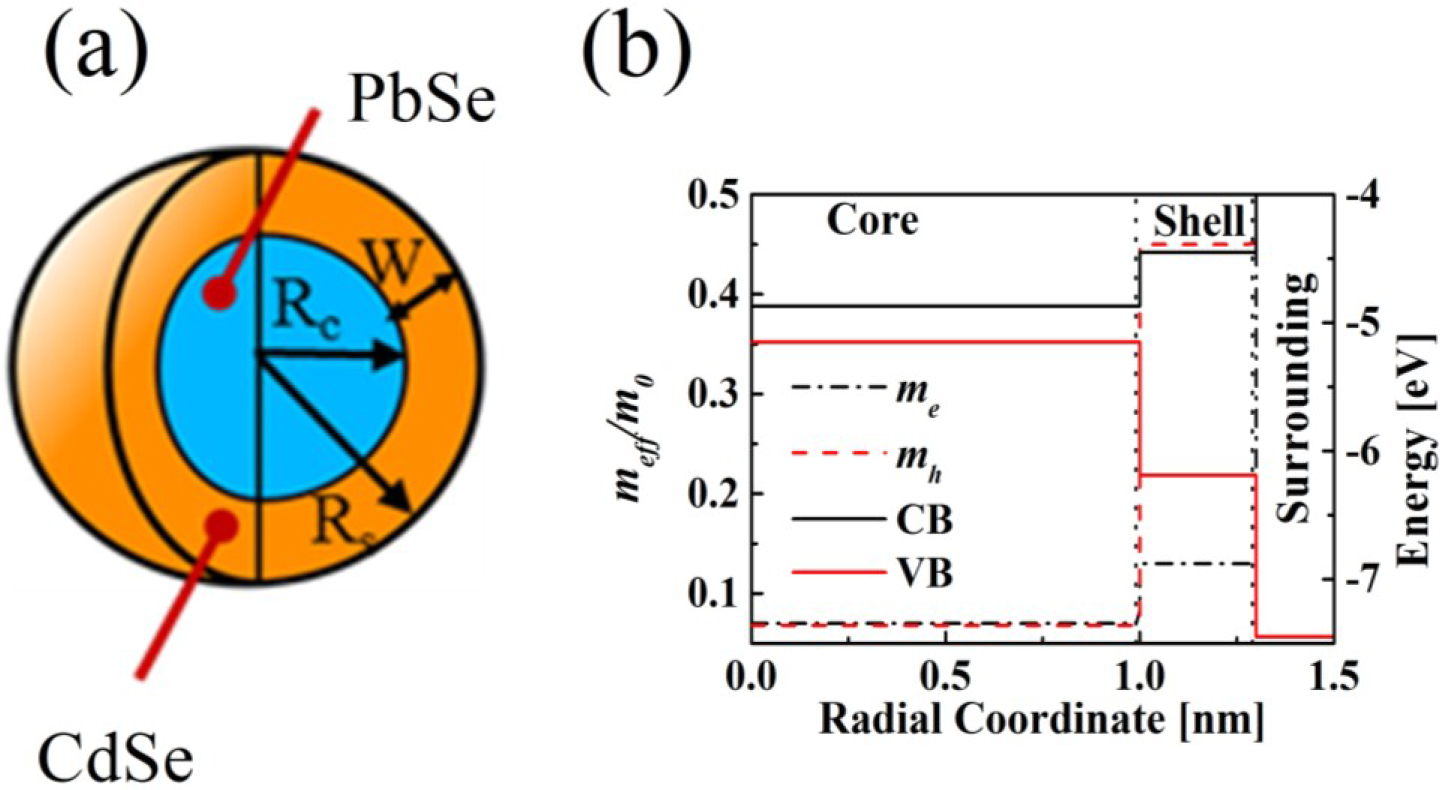 (b) Dependencies of the energy bands (VB, CB) and electron and hole effective mass (me and mh, respectively) values versus radial coordinate in the PbSe/CdSe QD schematically represented in (a).