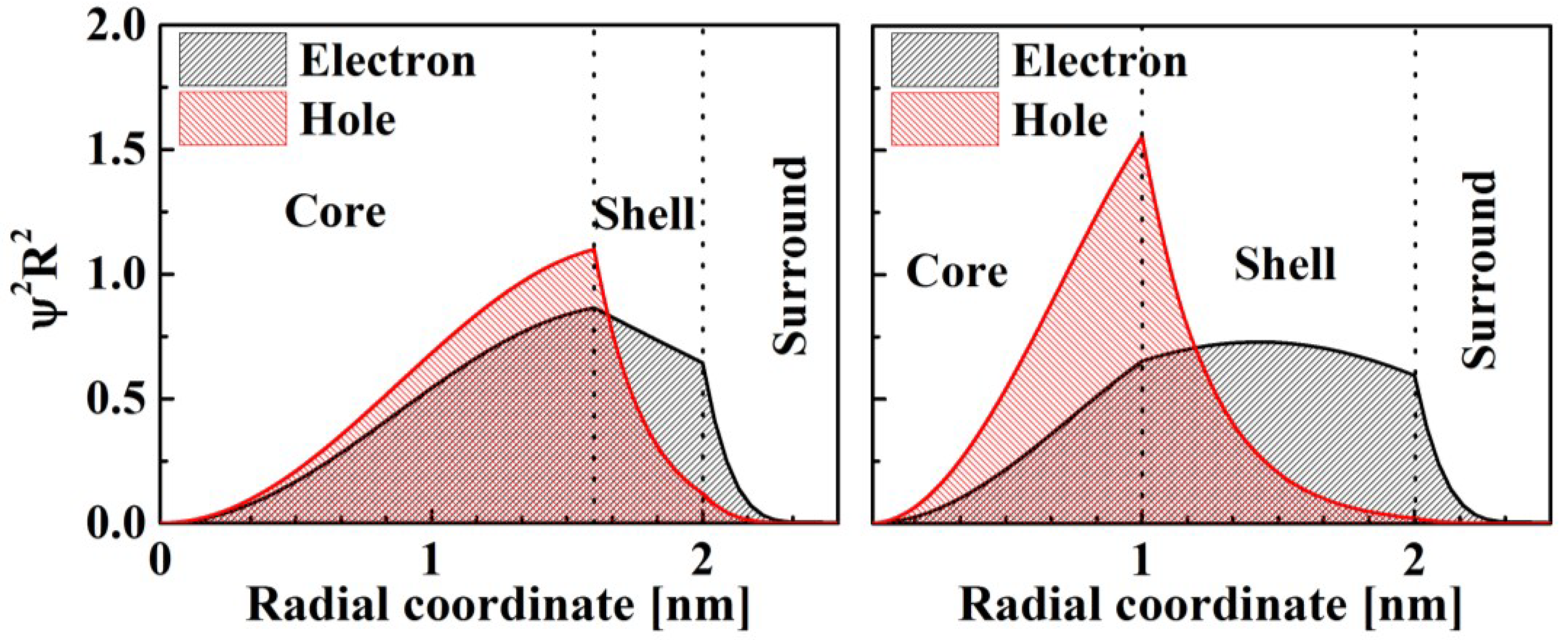 The shell thickness is an essential parameter for controlling the electro-optical properties of quantum dots. However, if the shell thickness is chosen so as to provide optimal charge separation, the probability of finding the hole at the QD edge approaches zero (Figure 7b). Thus, employing the core-shell approach for engineering the electro-optical properties of QDs requires careful examination of the wave-function distribution in the particular heterogeneous structure.