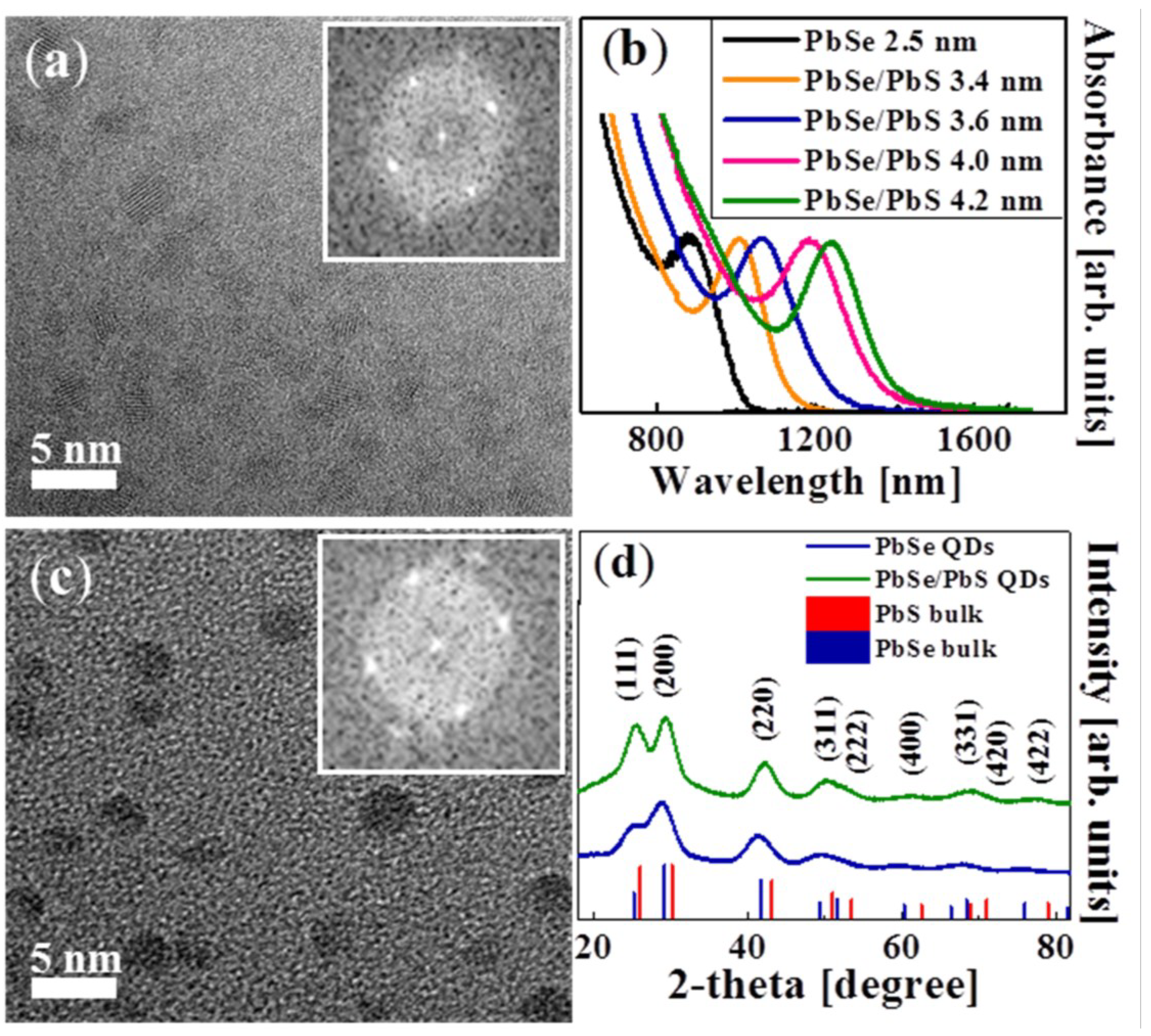 (a) HRTEM image of 2.5 ± 0.4 nm PbSe QDs and its FFT pattern (inset); (b) absorption spectra of the same PbSe and PbSe/PbS QDs with the same core diameter as in (a) and with different shell thickness and the total diameter (see the legend); (c) HRTEM image of 3.5 ± 0.5 nm PbSe/PbS QDs and its FFT pattern (inset); (d) XRD patterns of PbSe (blue line) and PbSe/PbS (green line) QDs indexed to the bulk rock-salt crystal structures of PbSe (blue vertical lines) and PbS (red vertical lines).