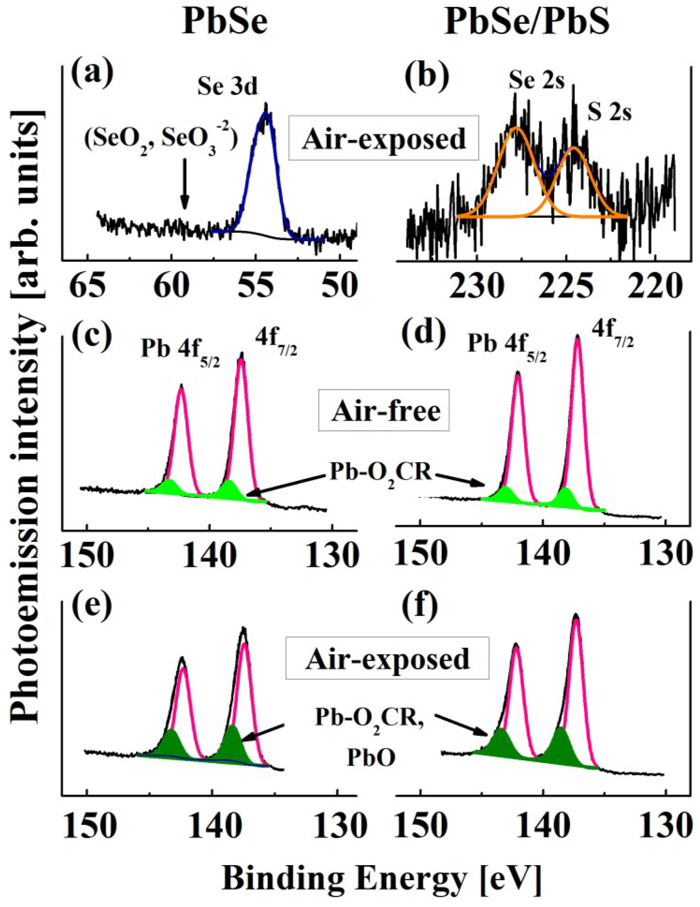 Representative XPS spectra of air-free/air-exposed PbSe QDs (2.5 ± 0.4 nm in diameter) and of PbSe/PbS QDs (3.5 ± 0.5 nm in diameter) are shown in Figure 9. The 4f5/2 and 4f7/2 spin-orbit splitting of the Pb 4f level in air-free PbSe and PbSe/PbS QDs are shown in Figure 9c,d, respectively. Both the 4f5/2 and 4f7/2 peaks were additionally resolved into two doublets each, one doublet corresponding to the lead-chalcogen bond (Pb–Se/S; pink) and the other one corresponding to the lead-oxygen bond (Pb–O; green), which originates from the surface lead ions bound to the oleic acid ligands (–O2CR). The binding energies (BEs) corresponding to the XPS peaks are summarized in Table 1. Figure 9e,f shows the XPS spectra of the same QDs as in Figure 9c,d, after 50 min of air exposure. Here, both the 4f5/2 and 4f7/2 doublets were also resolved into two additional doublets, one of them corresponding to the lead-chalcogen bond (Pb–Se/S; pink) and the other one corresponding to the lead-oxygen bond (Pb–O; dark green), which originates from the surface Pb ions bound to the oleic acid ligands (–O2CR) and also from the oxidized surface Pb ions, e.g., from PbO. The comparison of the light-green and the corresponding dark-green areas of the PbSe and PbSe/PbS QD peaks, respectively, shows a ~three-fold increase of the PbO-related signal in the air-exposed QDs as compared to the air-free QDs.