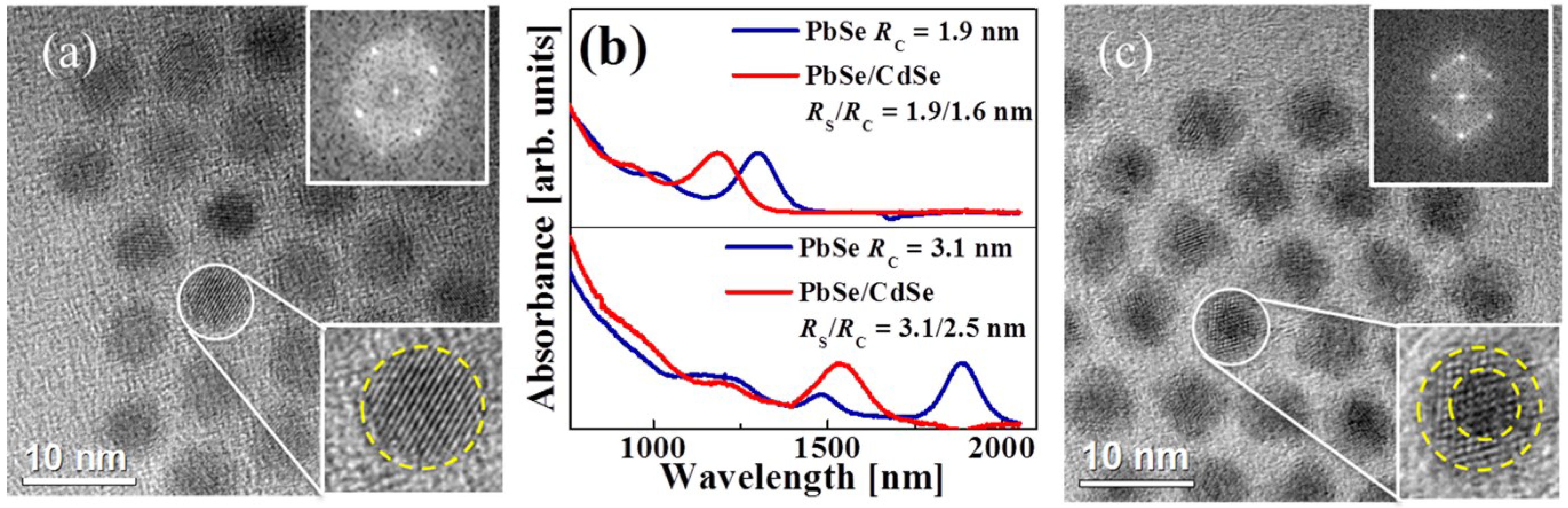 (a) HRTEM image of 6.2 ± 0.4 nm PbSe QDs. Insets: (bottom) an enlarged image of a single QD, (top) the corresponding FFT pattern; (b) absorption spectra of PbSe and PbSe/CdSe QDs with different RS/RC ratios as indicated in the legend. Cation exchange reaction was performed at 100 °C for 30 min, Cd:Pb = 10 (bottom panel) and for 35 min, Cd:Pb = 50 (top panel); (c) HRTEM image of 6.2 ± 0.4 nm PbSe/CdSe. Insets: (bottom) an enlarged image of a single core/shell QD (RS/RC = 3.1/2.5 nm), which shows clear contrast between the core and the shell components; (top) the corresponding FFT pattern. Cation-exchange reaction performed at 100 °C for 35 min, Cd:Pb = 50.