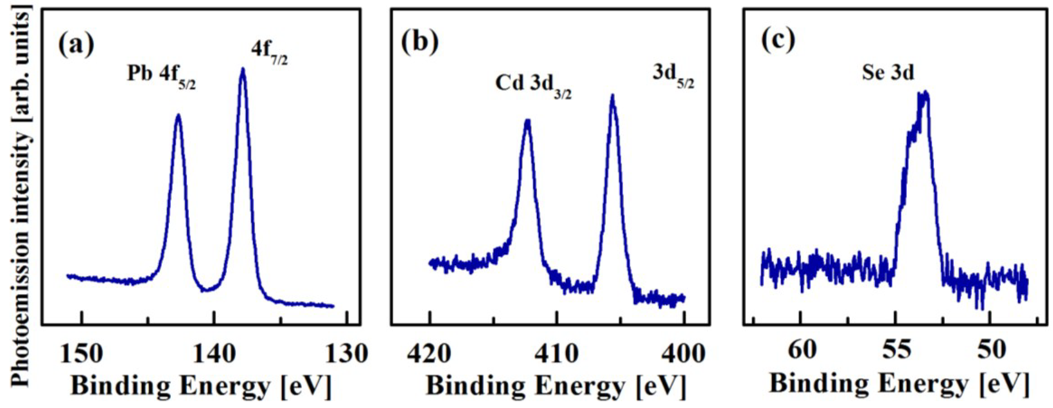 Representative XPS spectra of the air-free PbSe/CdSe QDs with RS/RC = 3.1/2.5 nm are shown in Figure 12. The elemental analysis of different samples consistently showed the presence of all three elements: Pb, Cd, and Se, the characteristic Pb 4f, Cd 3d, and Se 3d XPS peaks, being displayed in Figure 12a–c. The 4f5/2 and 4f7/2 spin-orbit splitting of the Pb 4f level occurs at BE values of 142.8 and 138 eV, respectively, while the 3d3/2 and 3d5/2 spin-orbit splitting of the Cd 3d level occurs at BE values of 412.3 and 405.5 eV, respectively. As expected, no Cd signal was detected in PbSe QDs. The Se 3d5/2 XPS peak appears at the BE value of 54.1 eV. The characteristic BE values for Pb and Se do not differ from those obtained for PbSe (Figure 9 and Table 1).
