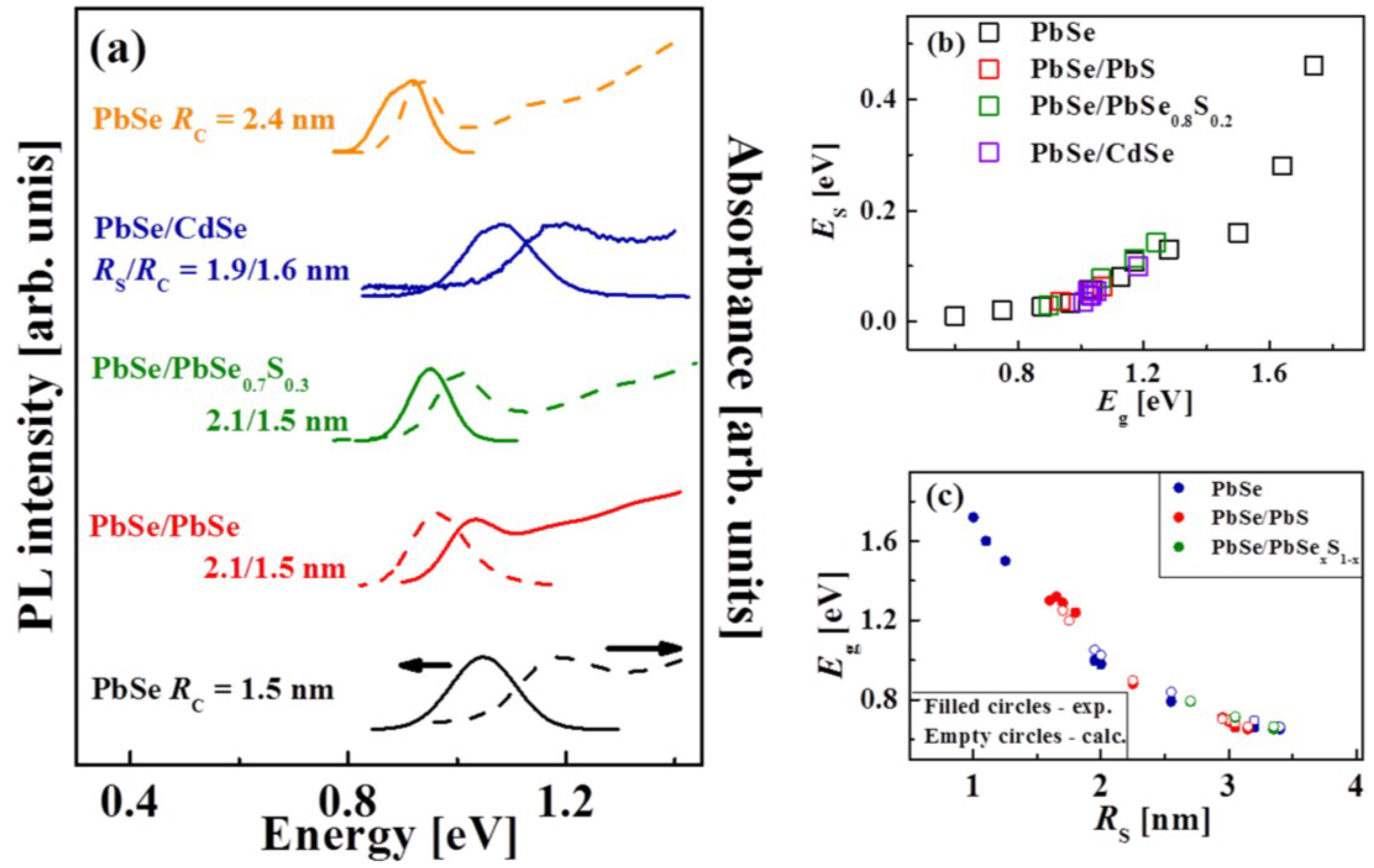 (a) Absorption (dashed lines) and emission (solid lines) spectra of PbSe core QDs and core/shell QD of various size, Rs/Rc ratio, and composition (see the legend); (b) dependence of Stokes-shift energy, ES, on Eg for QDs of different composition (see the legend); (c) calculated (empty circles) and experimental (filled circles) values of the band-gap energy, Eg, as a function of Rs for various QDs (see the legend).