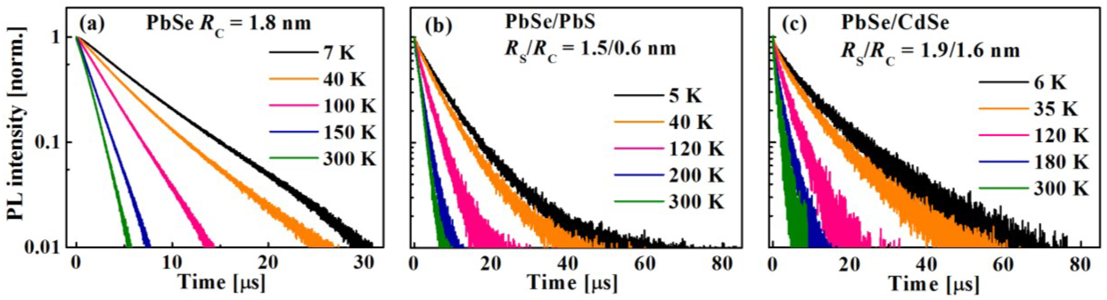 - Abel, K.A.; Qiao, H.; Young, J.F.; van Veggel, F.C.J.M. Four-fold enhancement of the activation energy for nonradiative decay of excitons in PbSe/CdSe core/shell versus PbSe colloidal quantum dots. J. Phys. Chem. Lett. 2010, 1, 2334–2338. [Google Scholar] [CrossRef]