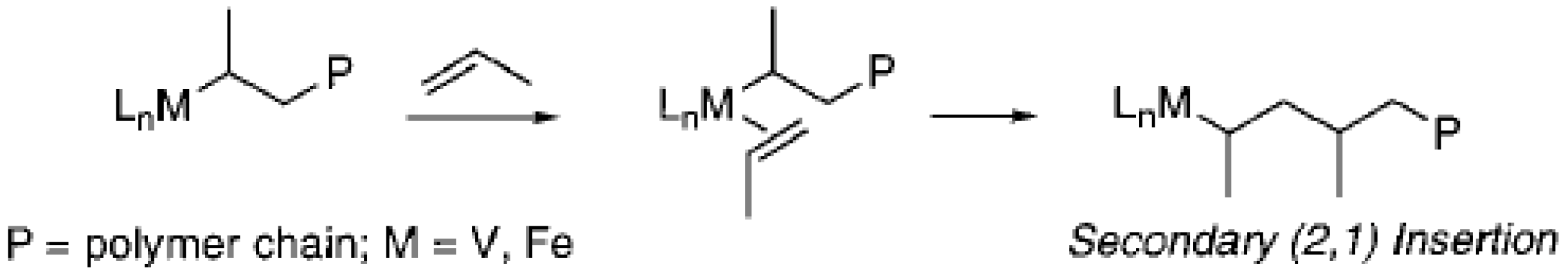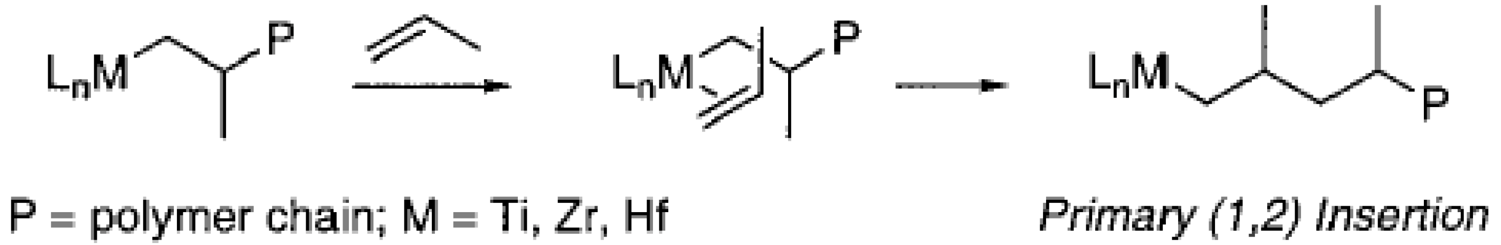 - Caporaso, L.; de Rosa, C.; Talarico, G. The relationship between catalyst precursors and chain end groups in homogeneous propene polymerization catalysis. J. Polym. Sci. A Polym. Chem. 2010, 48, 699–708. [Google Scholar] [CrossRef]