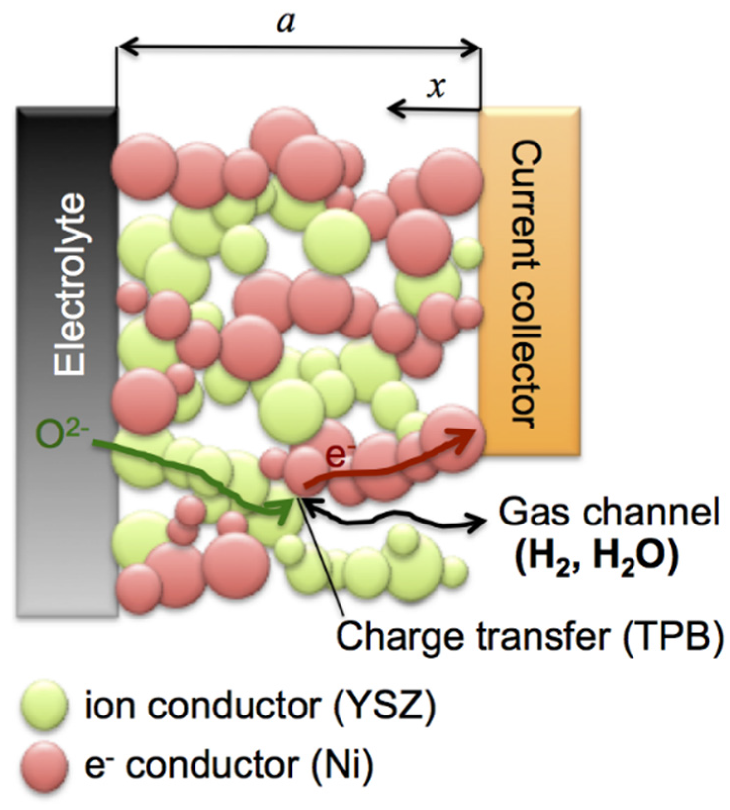 Porous Ni-YSZ is a state-of-the-art anode material for SOFC applications. The anode reaction mechanism includes a coupling of ionic and electronic charge transport with charge transfer, as illustrated in Figure 1. Each phase is responsible for a specific transport process, i.e., oxide ions in YSZ, electrons in Ni, and gas/fuel in the pores. The charge transfer reactions take place at the triple phase boundary (TPB). The microstructure of the fresh anode material has a strong impact on the initial performance as well as on the long-term stability and lifetime.