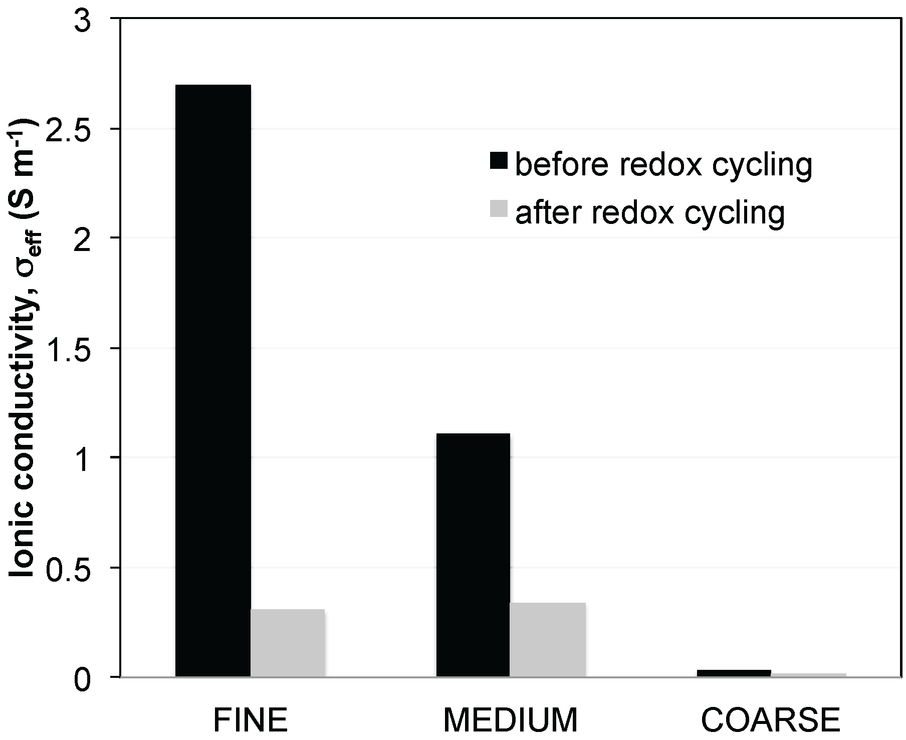 The fine anode initially has a dense microstructure due to its relatively high sintering activity of the fine YSZ grains. The two main degradation features upon redox cycling are irreversible volume expansion and Ni agglomeration. The ionic conductivity decreases in the fine anode, which is mainly due to a reduction of bottleneck dimensions in YSZ (i.e., decrease of constrictivity β). The ionic conductivities of fine, medium, and coarse anodes are shown in Figure 2. For the coarse anode the main degradation feature upon redox cycling is the loss of YSZ connectivity, which is attributed to weak bottlenecks associated with the low sintering activity of coarse YSZ grains. As shown in Figure 2, the ionic conductivity is already very low in the initial state due to the low constrictivity (β). Redox cycling affects all three parameters (Φeff, β, and τ) of the coarse YSZ phase so that the ionic conductivity drops to almost 0 (S/m). In contrast, the electrical conductivity of the coarse anode does not degrade significantly upon redox cycling.