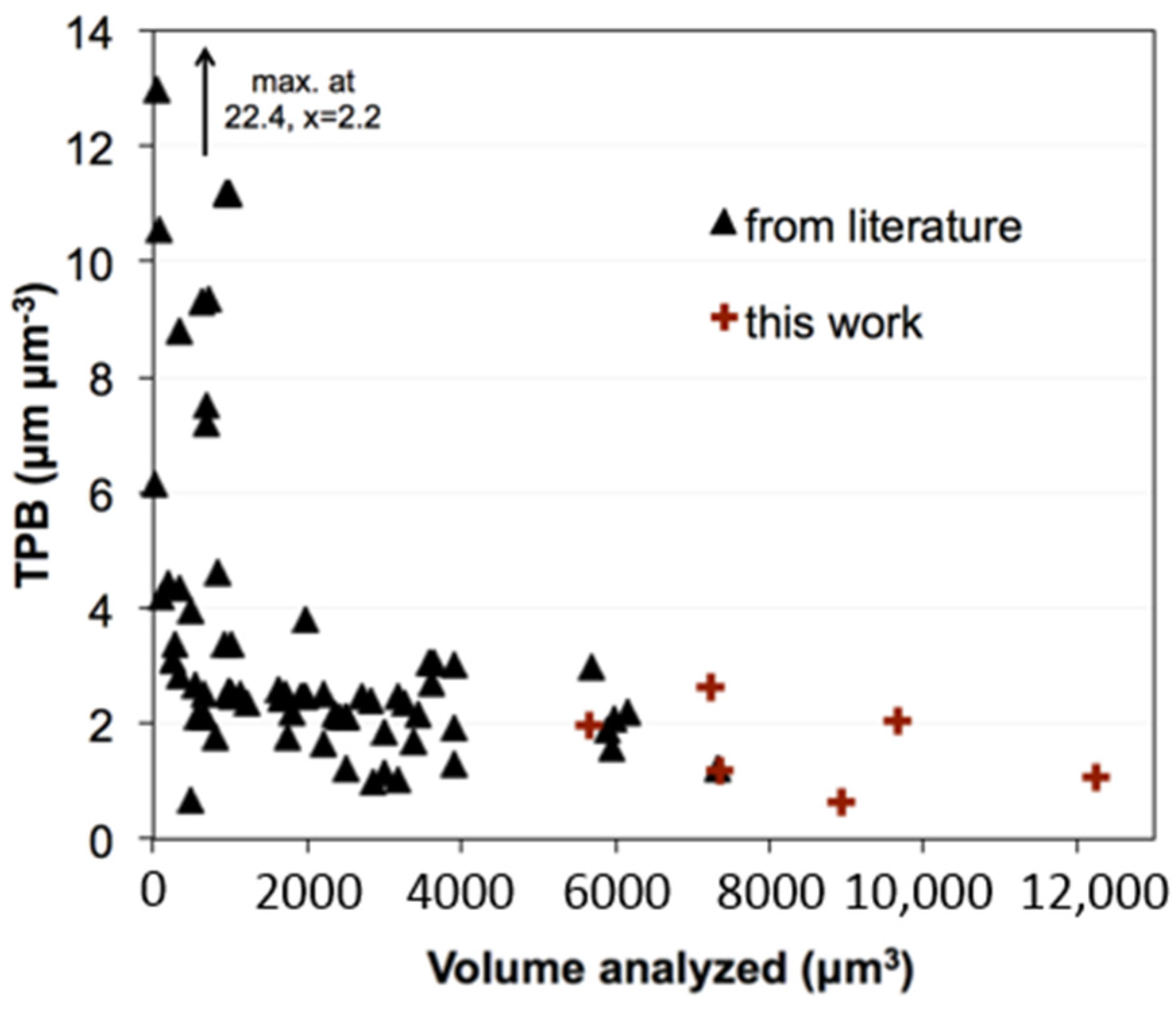 In literature [7,8,13,14,15,16,17,18,19,20,21,22,23,24,25,26,27,28,29,30,31,32,33,34,35,36,37] some very high TPB values (up to 22.4 μm−2) are reported for Ni-YSZ anodes. As shown in Figure 3, those high TPB values are exclusively measured for small sample volumes (<1000 μm3). Therefore, the high TPB values are most probably an artifact from lack of representative elementary volume (REV). In fact, all data points from larger sample volumes (>1000 μm3) exhibit TPB values in a relatively narrow range between 1 and 4 μm−2. More explanation about compilation of Figure 3 is given in the supplementary material.