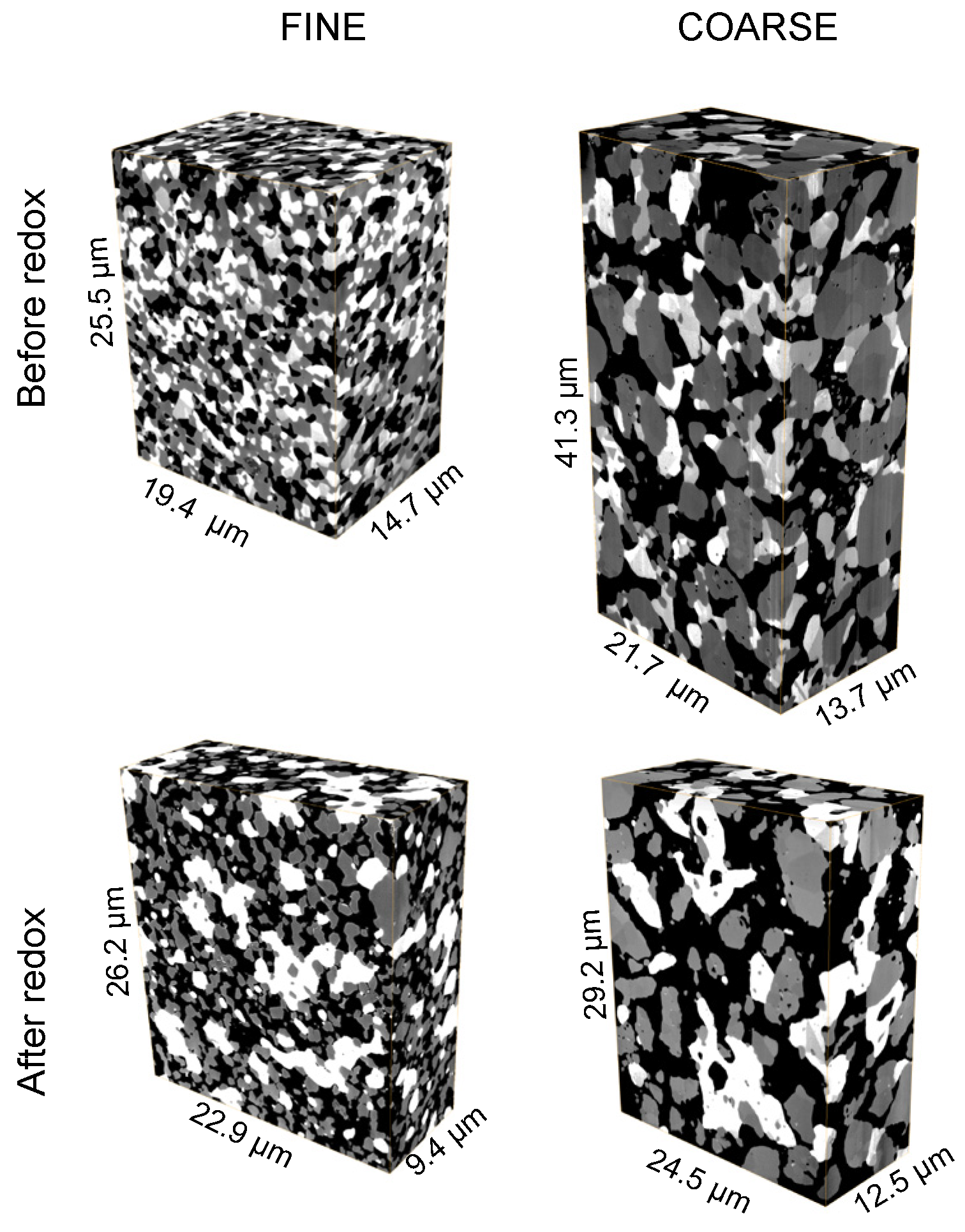 3D reconstructed microstructures of fine and coarse anodes before and after redox cycling obtained from FIB-tomography. Pores (black), YSZ (gray), and Ni (white). Significant Ni coarsening is visible in the samples after redox cycling. Note: Additional visualizations of all three anodes (fine, medium, coarse) are given in previous publications [4,40].
