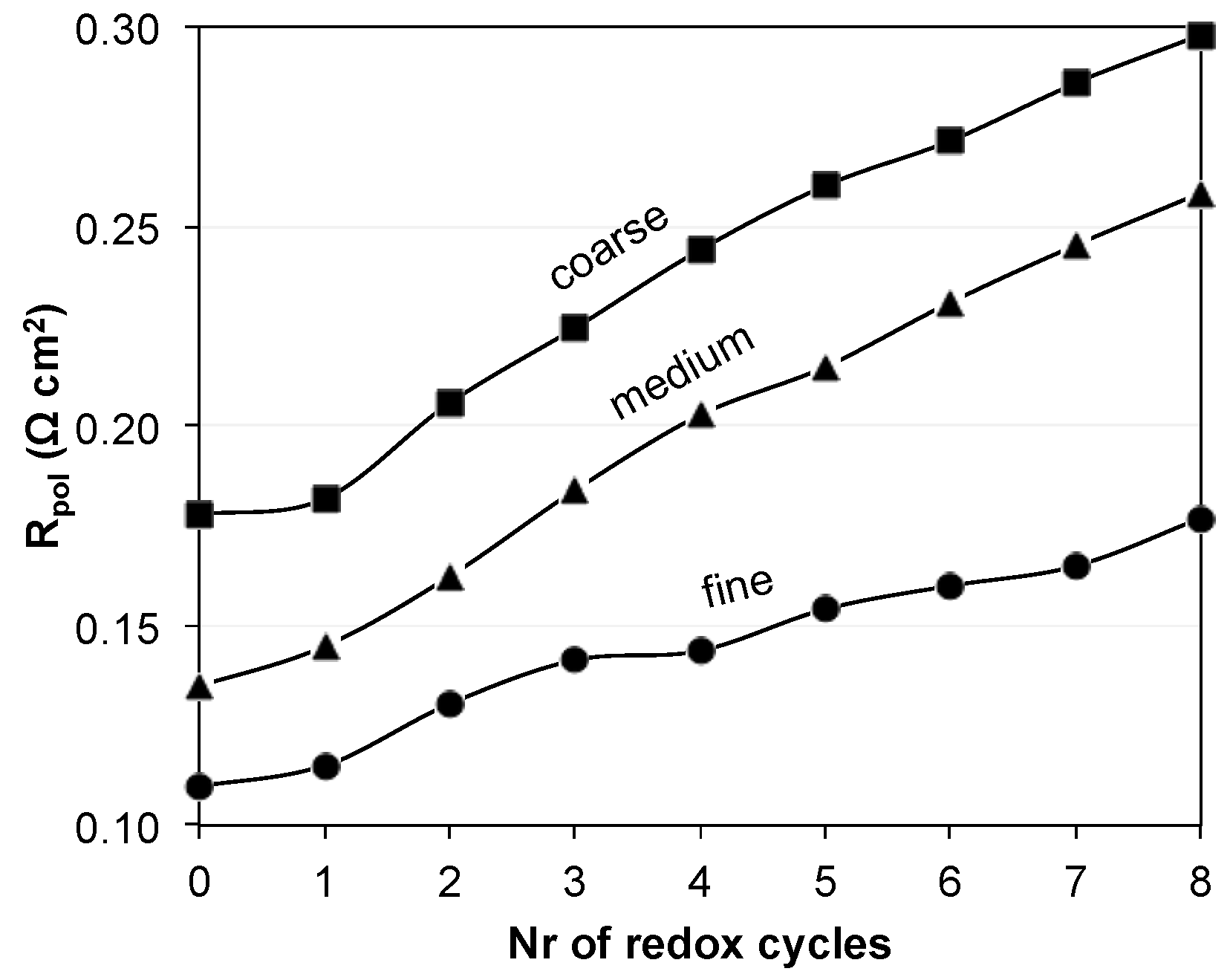 Figure 5 shows the evolution of the polarization resistance (Rpol) of the fine, medium, and coarse anodes upon redox cycling. The degradation of Rpol over eight redox cycles is stronger in coarse and medium samples compared to the fine one, which is indicated by steeper slopes for medium and coarse anodes in Figure 5. The initial Rpol (0th) increases from fine to coarse. The change in Rpol, given by the difference between the 0th and 8th cycles (initial and final resistances) is similar for the medium and coarse anodes (ca. 0.120 Ω·cm2), while it is smaller for the fine anode (0.07 Ω·cm2).