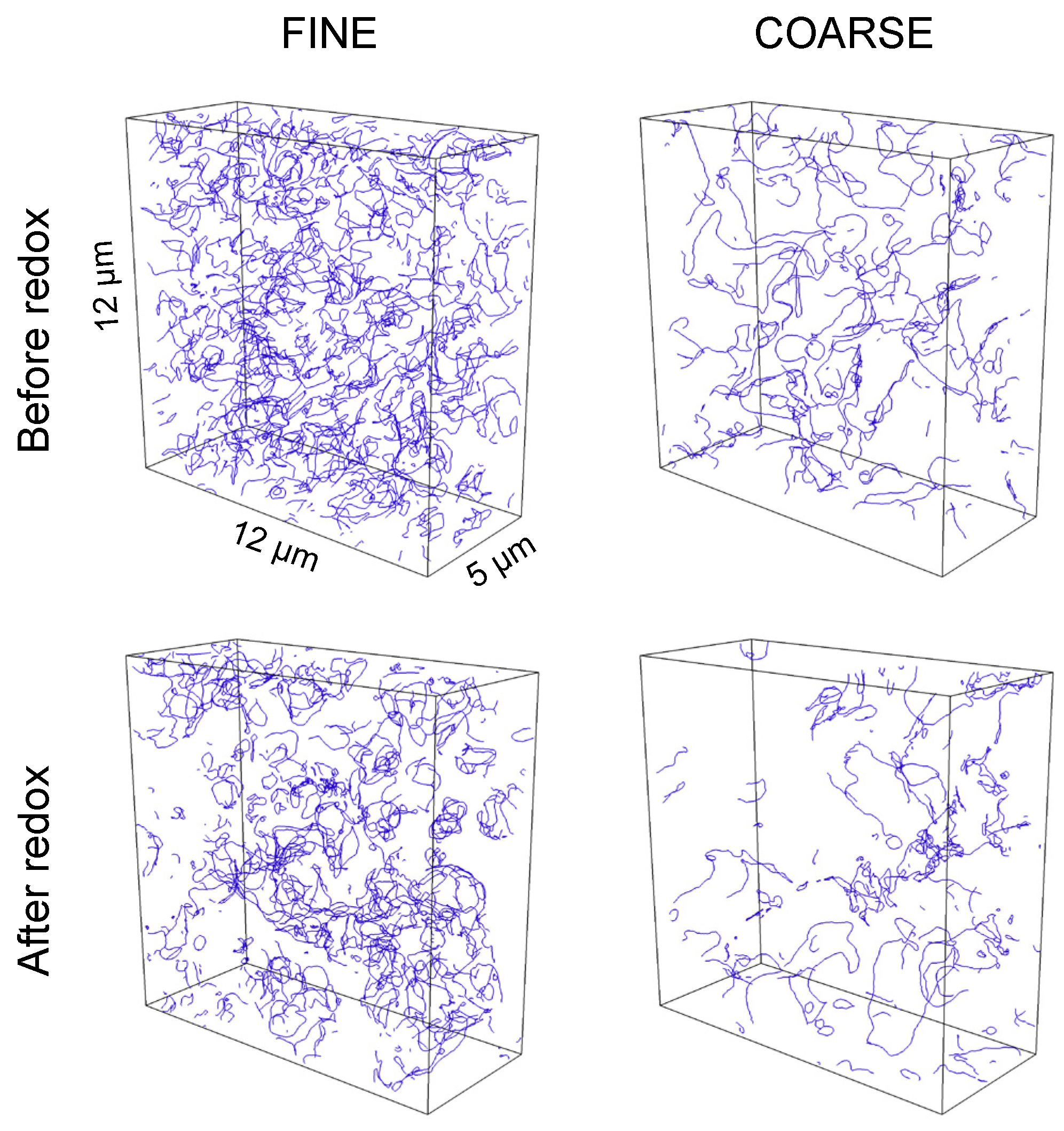 TPB lines (blue) determined from tomographic data for the fine and coarse anodes. Redox cycling obviously leads to a decrease of TPB density. Note: Some of the TPBs are not active, due to loss of phase connectivity in one of the transporting phases (not shown). Loss of connectivity is particularly strong for the YSZ phase in the coarse anode after redox cycling (bottom right). Total and active TPB lengths are given in Figure 7.