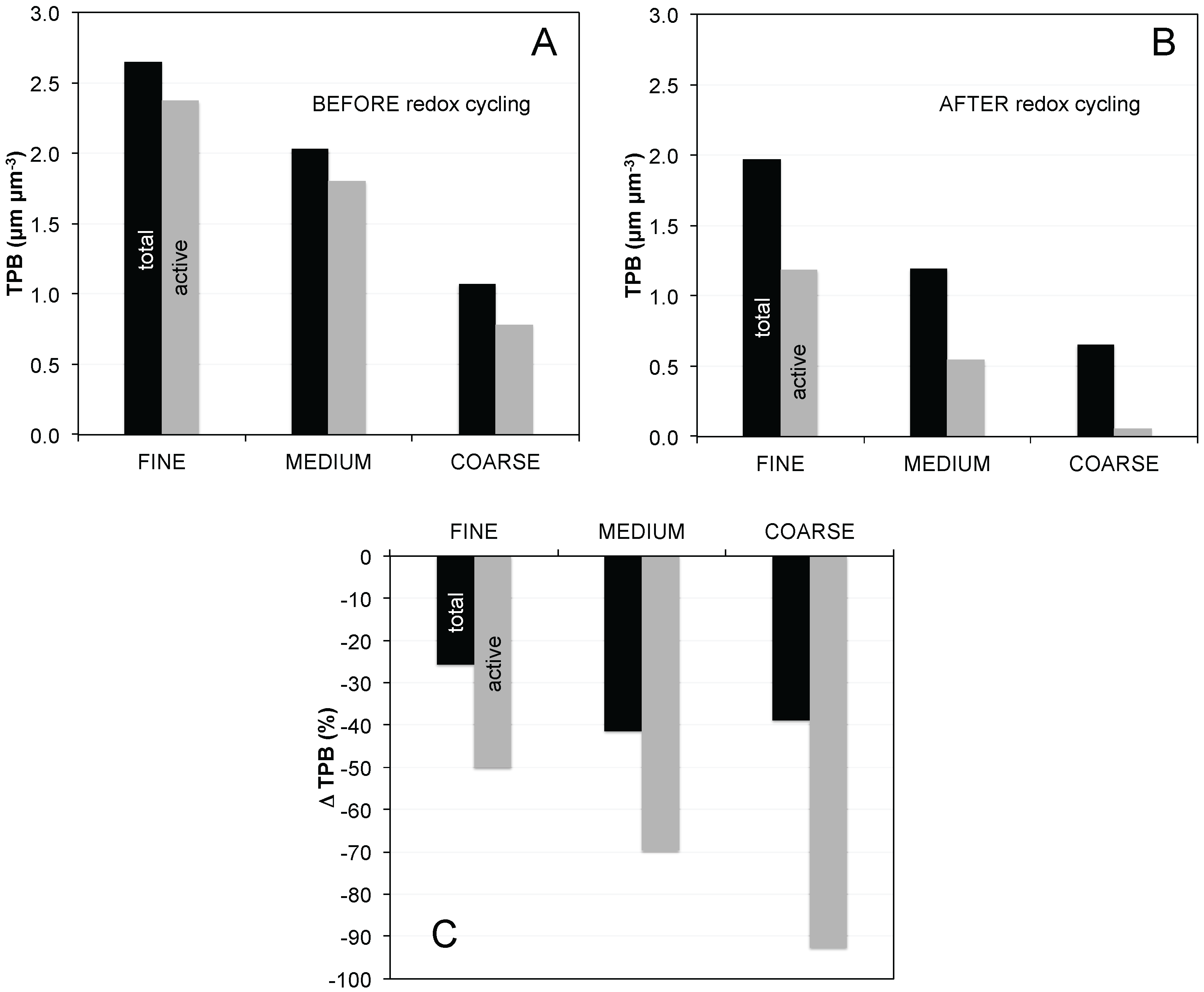 Overall, Figure 10 documents that Rpol and TPB do not follow a simple linear relationship, otherwise the data points in Figure 10A,B, would plot on straight lines and the degradation ratios would be equal for fine, medium, and coarse. The changing values of the degradation ratios indicate that there is no simple and linear micro-macro-relationship (ΔRpol/ΔTPB), neither for TPBtotal nor for TPBactive.