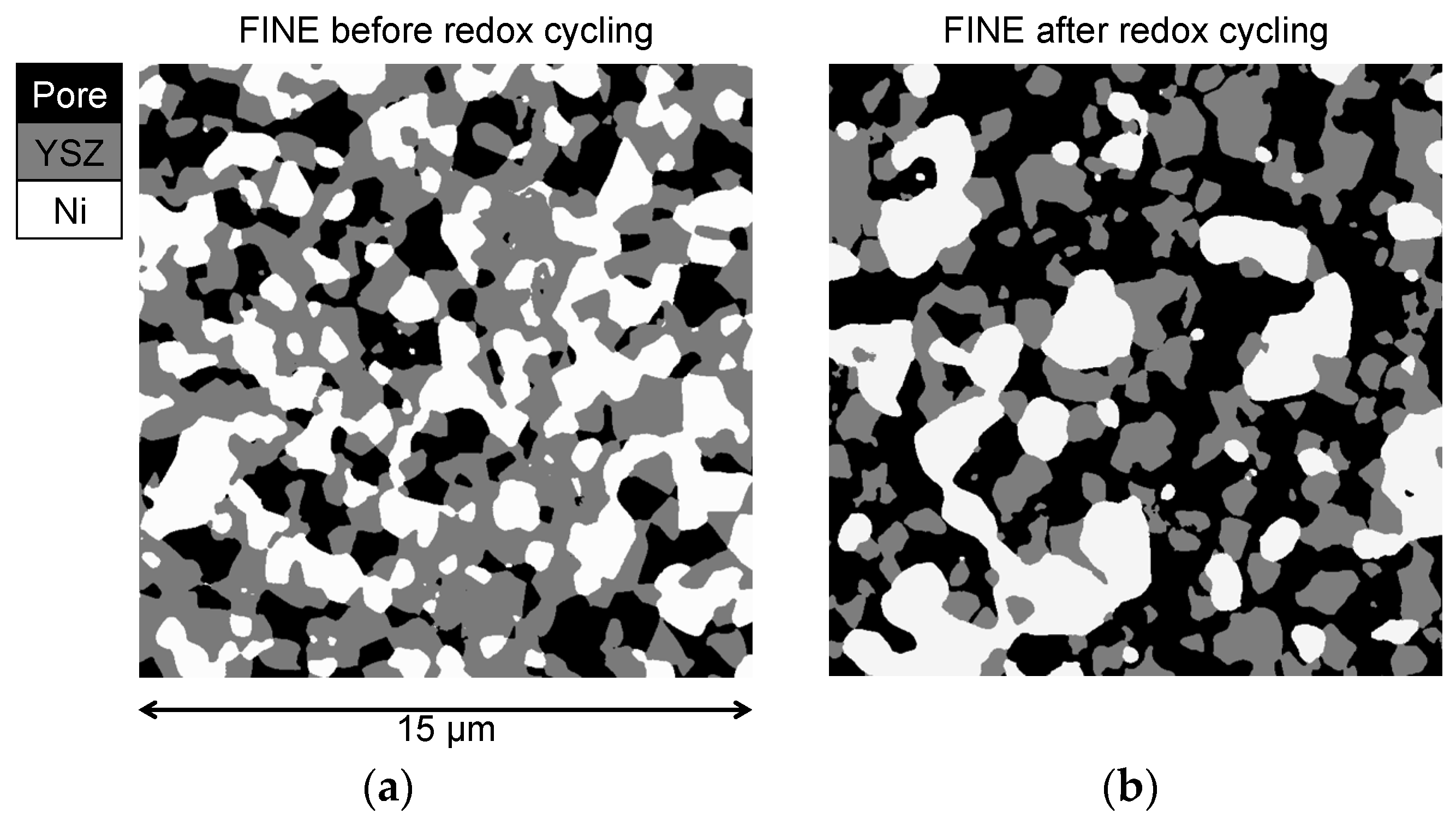 Microstructures of the fine anode before (a); and after redox cycling (b). After redox cycling, Ni forms larger particles and some isolated islands, which results in a loss of TPBtotal and TPBactive.