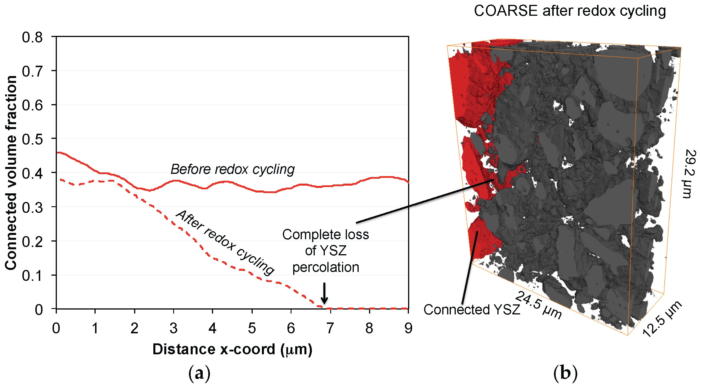 (a) Profiles of connected volume fractions of YSZ in the coarse anode as a function of the distance to the electrolyte-anode interface (x-direction). After redox cycling, complete loss of percolation is observed at ca. 7 μm; (b) 3D reconstructed image of YSZ showing the connected particles (red) confined to a region near the electrolyte-anode interface.