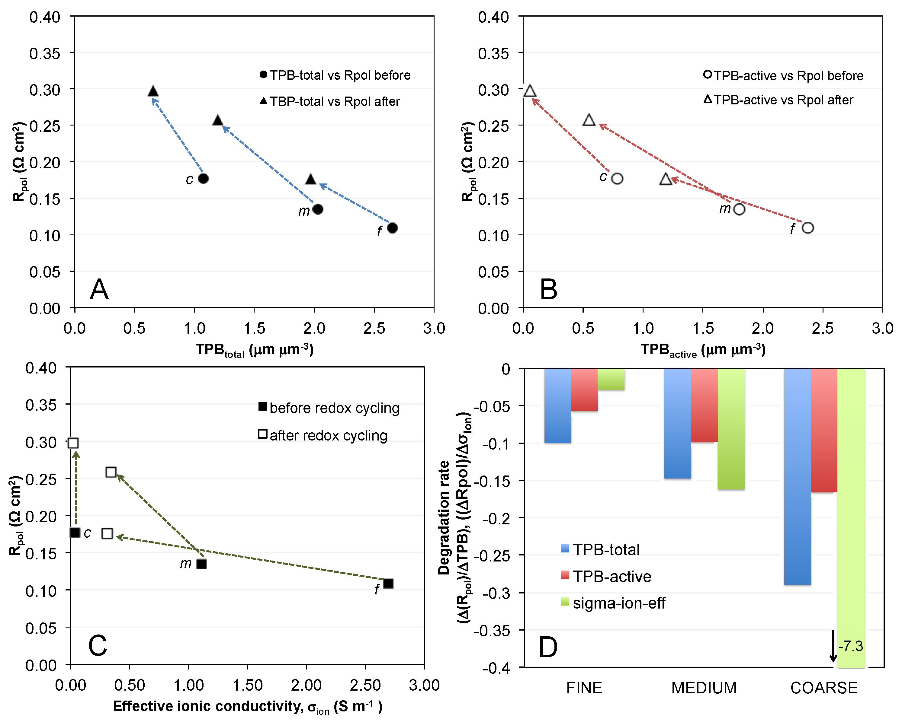 Polarization resistance (Rpol) versus (A) TPBtotal; and (B) TPBactive before and after redox cycling. Degradation ratios (indicated by arrows) include a y-component for the changes in polarization resistance (Rpol) and an x-component for changes of TPB. The slopes of the degradation are shown as a bar plot (D). It documents that the influence of ΔTPB on ΔRpol does not follow a constant slope. The degradation ratios ΔRpol/ΔTPB increase from fine to coarse; (C) The relationship between Rpol and effective ionic conductivity shows a similar pattern of degradation ratios with steeper slopes for coarser microstructures.