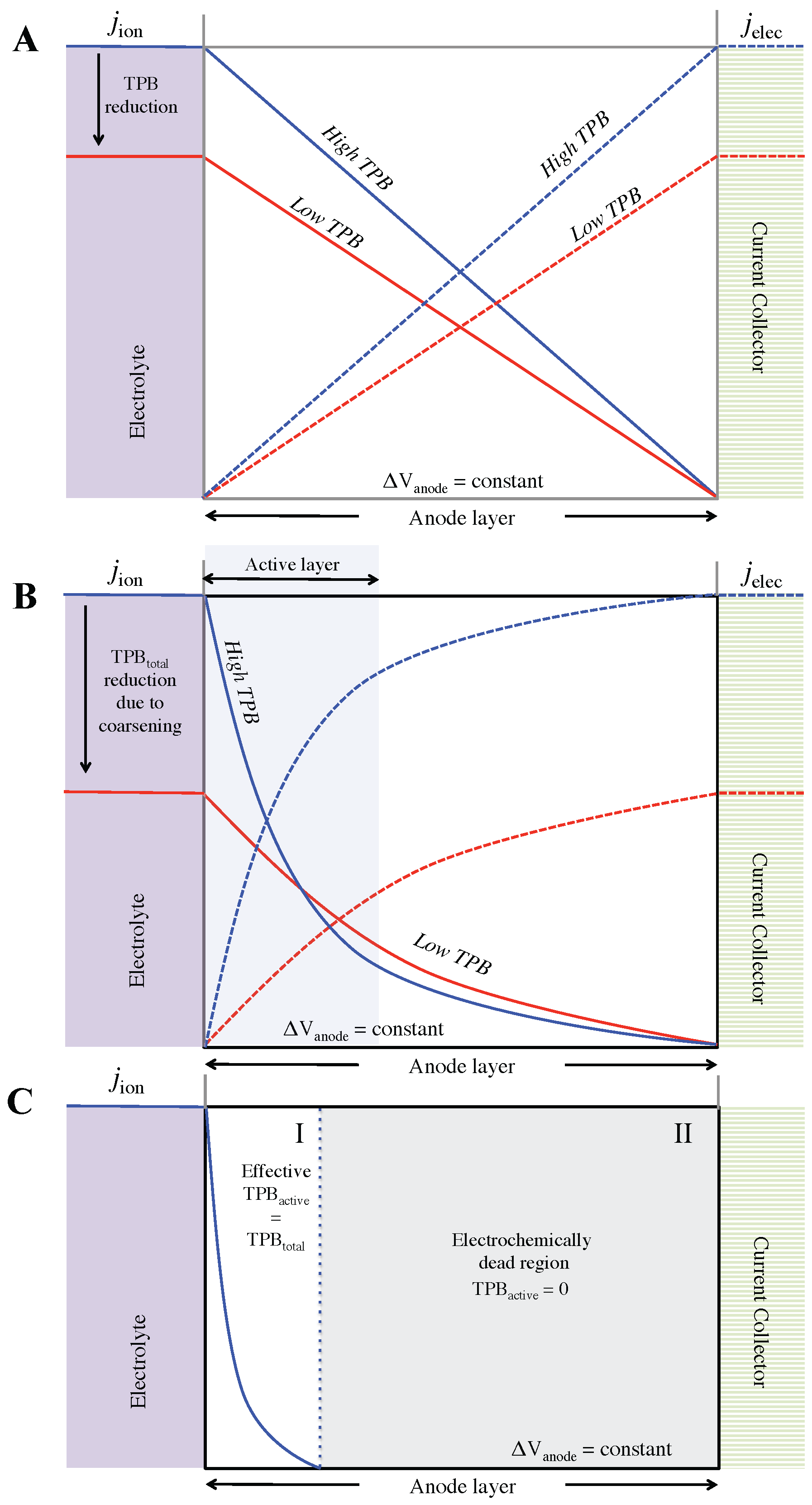 Schematic representation of current density distributions for three different anode scenarios, where jion decreases and jelec increases from left to right (jtot = constant): (A) Idealized scenario where no limitation on transport of mobile species exists. The whole anode acts as an active layer with constant electrochemical activity; (B) Anode scenario with limitations for ionic transport. This leads to a concentration of charge transfer reactions in the active layer and associated inhomogeneous distribution of current densities. This scenario is representative for most Ni-YSZ anodes, including Ni-coarsening as observed in the fine anode; (C) Anode scenario with low ionic conductivity including a complete loss of percolation for YSZ in domain II. This scenario is representative for the coarse anode before and after redox cycling. (j = current density, ΔV = voltage drop).