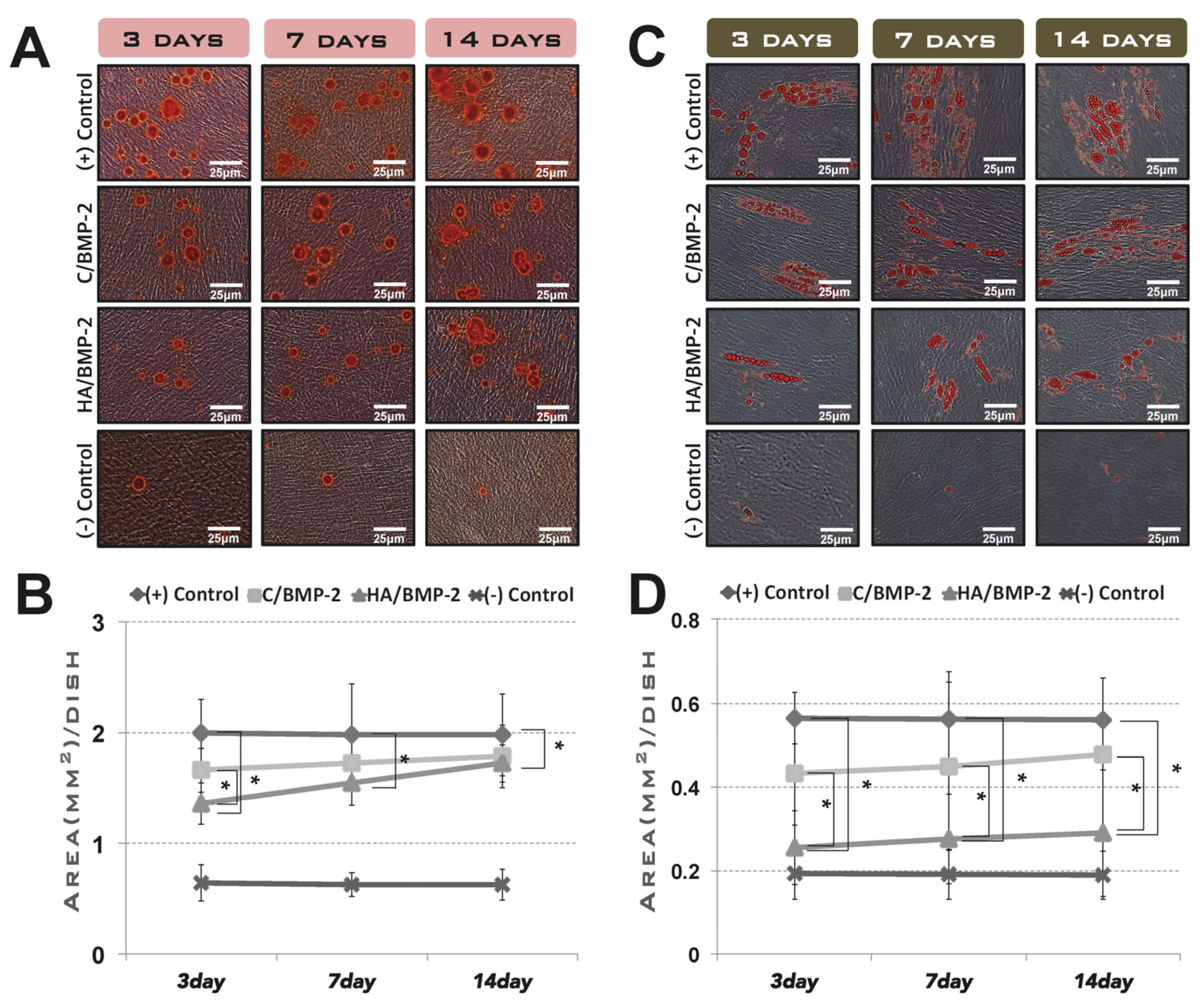 Multiple mineralized nodules and lipid vacuoles were observed at all induced sites of the positive control group and both experimental groups with released rhBMP-2, although negative control sites preincubated with standard medium also exhibited limited formation of these structures. The area of mineralized nodules and lipid vacuoles was largest at positive control sites preincubated with rhBMP-2 solution, uniformly regardless of the preincubation period (Figure 1). The C/BMP-2 and HA/BMP-2 groups exhibited decreased osteogenic and adipogenic induction compared to the positive control group, but the induction of cell differentiation increased with increasing preincubation periods (3, 7, and 14 days) and release of ErhBMP-2. There were statistically significant differences in osteogenic induction between positive control group and HA/BMP-2 group for all preincubation periods (Figure 1B), but adipogenic induction in the HA/BMP-2 group was significantly reduced compared to the both positive control and C/BMP-2 groups (Figure 1D).