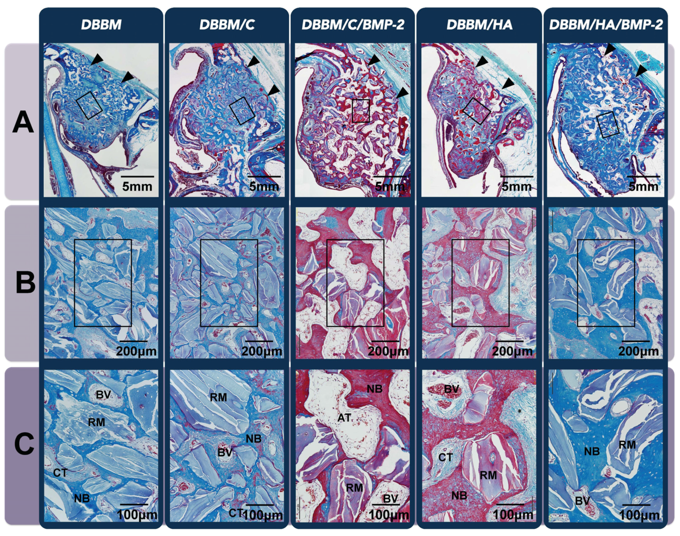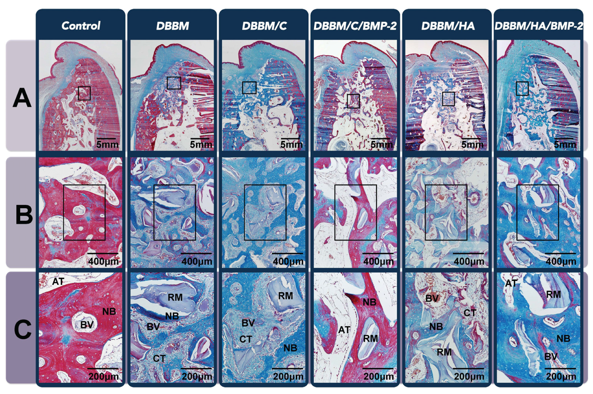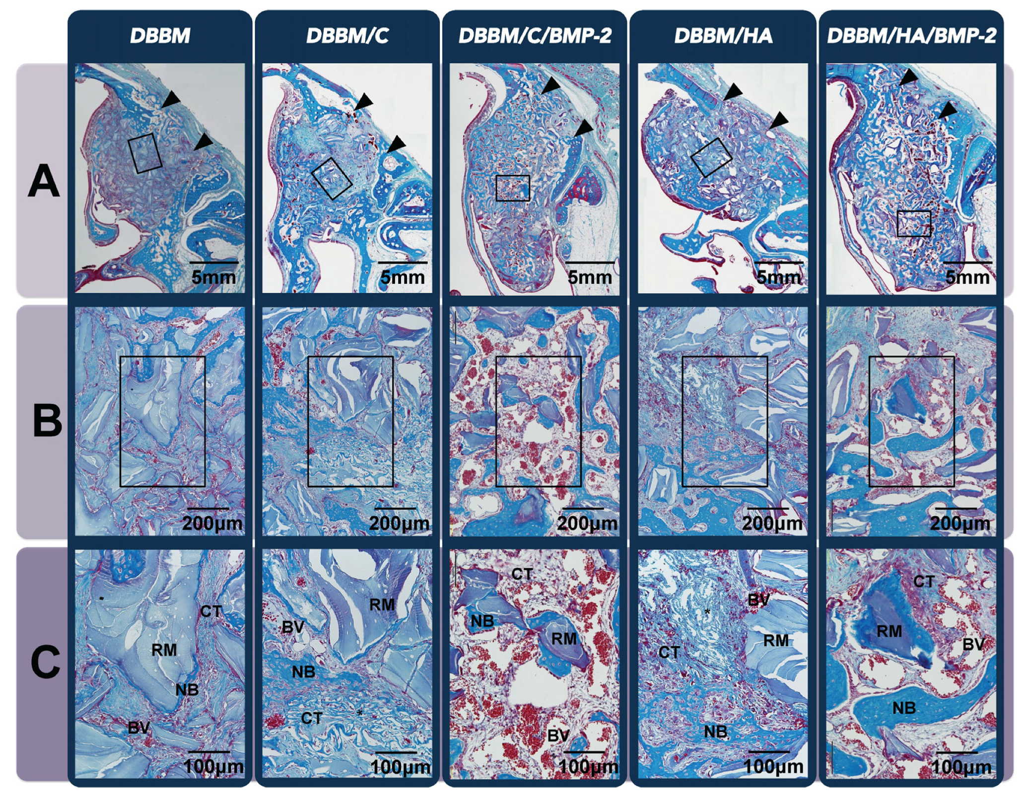 - DBBM/HA/BMP-2 group: experimental sites received DBBM and ErhBMP-2-loaded HA-coated collagen.