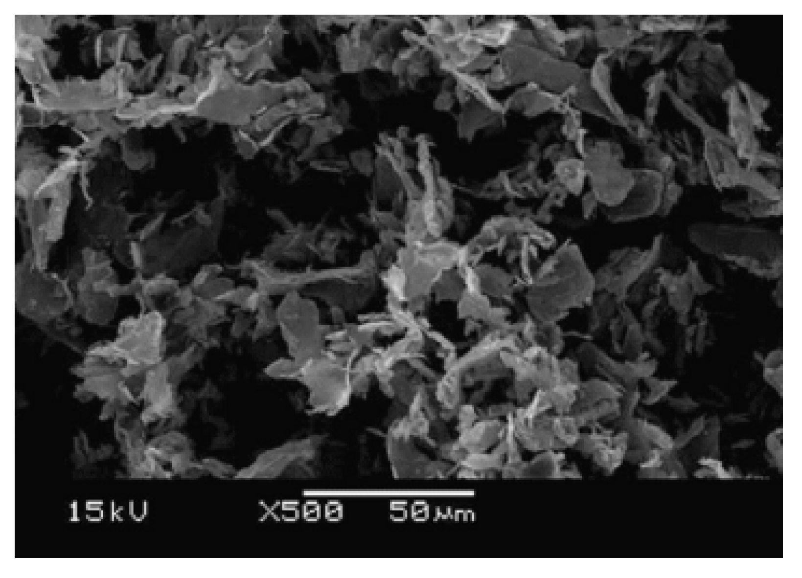 xGnP was prepared from sulphuric acid-intercalated expandable graphite (3772) (obtained from Asbury Graphite Mills, NJ, USA), by applying a cost- and time-effective exfoliation process that was initially proposed by Drzal’s group. xGnP, which combines the layered structure and low price of nanoclays with the superior mechanical, electrical, and thermal properties of carbon nanotubes, is very cost-effective, and can simultaneously provide a multitude of physical and chemical property enhancements [21,22]. Zeolite and perlite are porous materials and offer excellent adsorption performance of the pollutants. In this study, they are used for comparison with xGnP, and both natural and improved zeolites (JST-MS100, Daejin Chemical, Namyang-Ju, Korea) were used. Table 1 sets out the specific surface area (m2·g−1) and total pore volume (cm3·g−1) of the four samples by Brunauer Emmett Teller (BET) analysis, and Figure 1 shows the Scanning electron microscop (SEM) images of xGnP.
