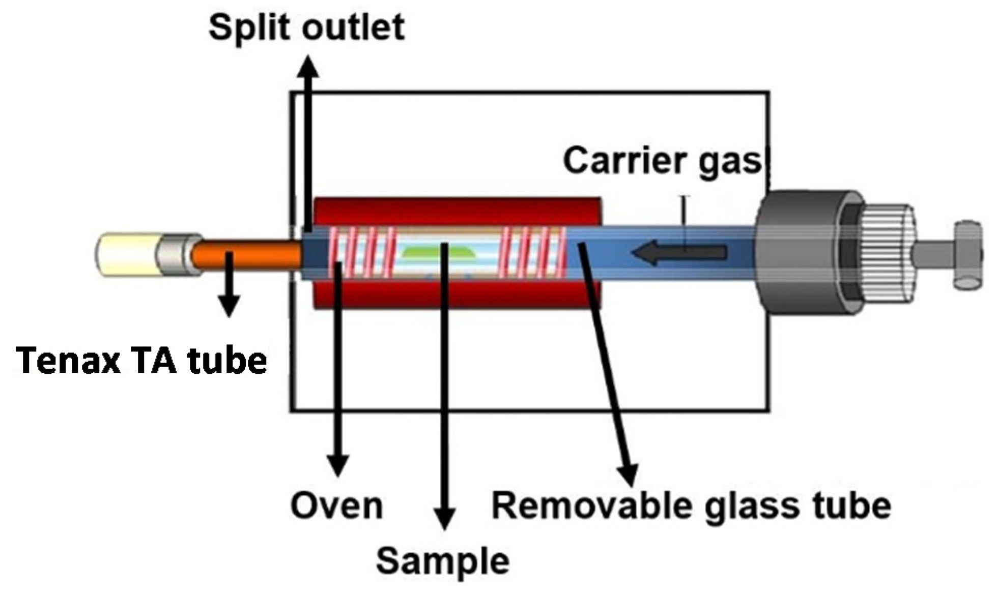 Figure 2 shows a schematic diagram of the thermal extractor (TE). The TE consists of an adjustable oven heating a glass tube with a sample inside. Adsorbed samples were placed in a glass extraction tube. The adsorbed sample size was limited, both by the diameter of the tube and by the heatable length of the oven, to a maximum of 70 mm. The VOCs were purged under a pure nitrogen gas stream at a constant flow on a Tenax TA tube and 2,4-DNPH (dinitrophenylhydrazine) cartridge; 2,4-DNPH, followed by high performance liquid chromatography (HPLC) analysis, is a widely used selective and sensitive method for the measurement of carbonyl compounds in air. In normal use, the entire gas flow passes over the adsorbent material. The sampling volume was 1 L [1,23]. The VOC concentrations were analyzed by using GC-MSD. GC-MSD is a gas chromatography (GC, Agilent-6890N, National Instrumentation Center for Environmental Management, Seoul, Korea)-mass spectrum detector (MSD, Agilent-5975, National Instrumentation Center for Environmental Management).