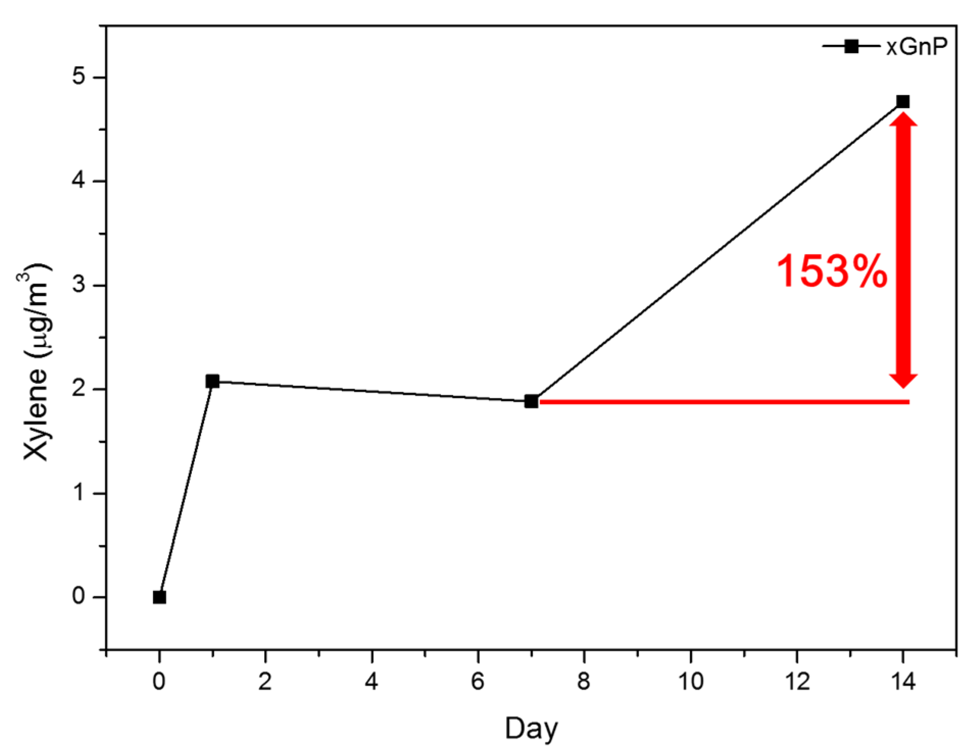 Figure 3 and Table 3 show the sustainability of the samples’ adsorption performance. As previously mentioned, the TVOC adsorption amount of perlite was the highest after seven days, with xGnP the next highest. However, during the second week, the TVOC adsorption amount of xGnP increased from 128.93 to 1545.31 μg/m3 on the 14th day. This was the highest adsorption amount among the four samples on the 14th day. In addition, xGnP’s adsorption of xylene increased by 153% during the second week. Figure 4 shows the xylene adsorption performance of xGnP. On the other hand, perlite, which showed the highest performance at seven days, was reduced from 150.48 to 101.95 μg/m3 on the 14th day. Over the entire sustainability evaluation period of 28 days, the TVOC adsorption amount of zeolite (JST-MS100) increased from 86.96 μg/m3 at seven days to 105.50 μg/m3 on the 14th day, and then fell back to 72.49 μg/m3 on the 28th day. Natural zeolite and perlite were decreased continuously from seven to 28 days. The TVOC adsorption amount of xGnP only tended to increase steadily. This result shows that xGnP is more advantageous than existing adsorption materials over this longer period of time.